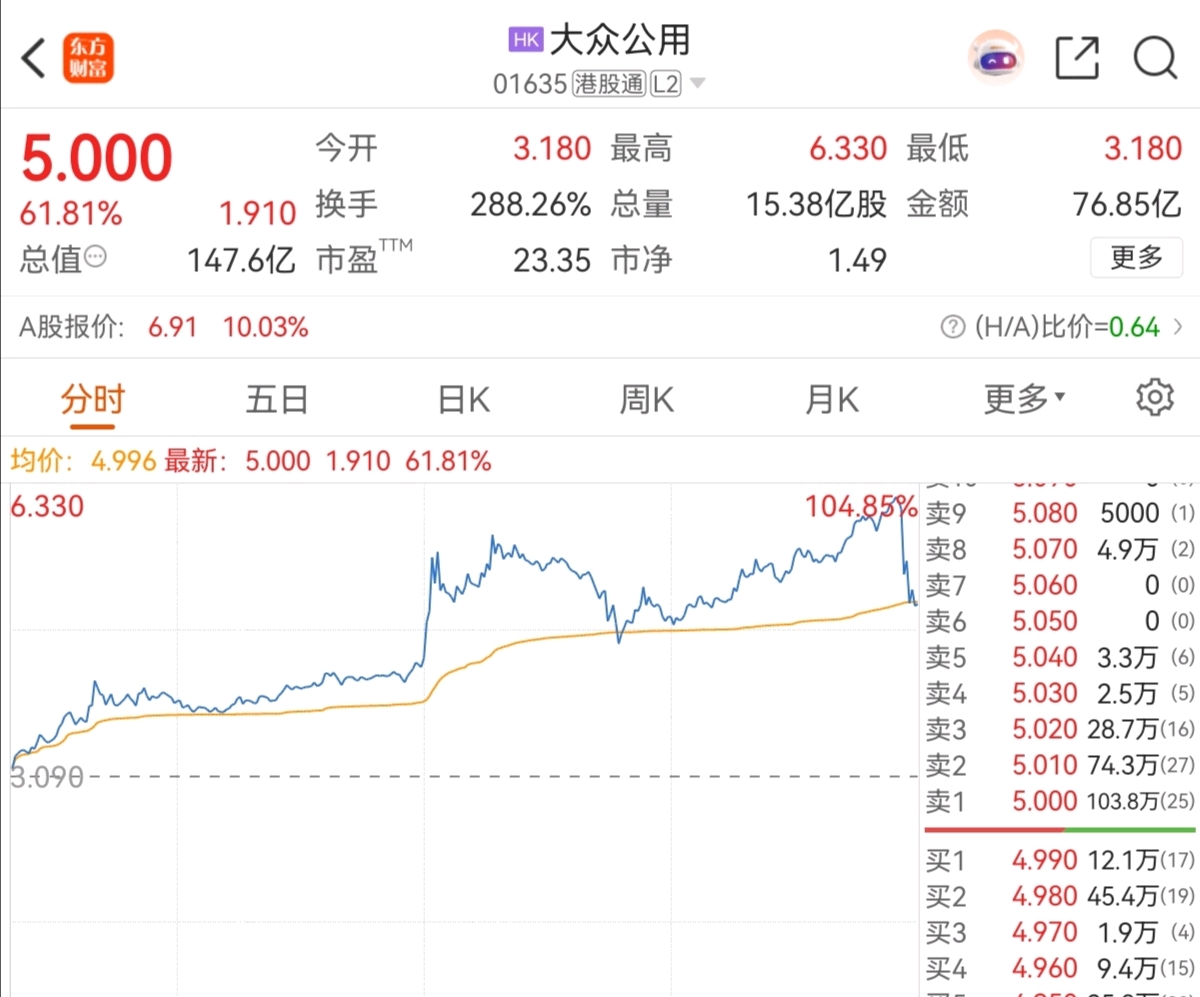 $大众公用(SH600635)$ 大众公用港H,今天最高长了105%,开什么玩笑