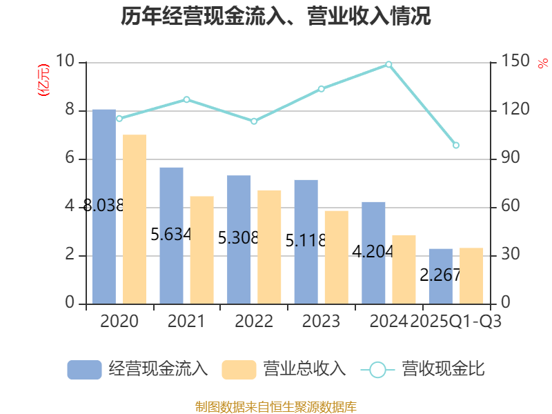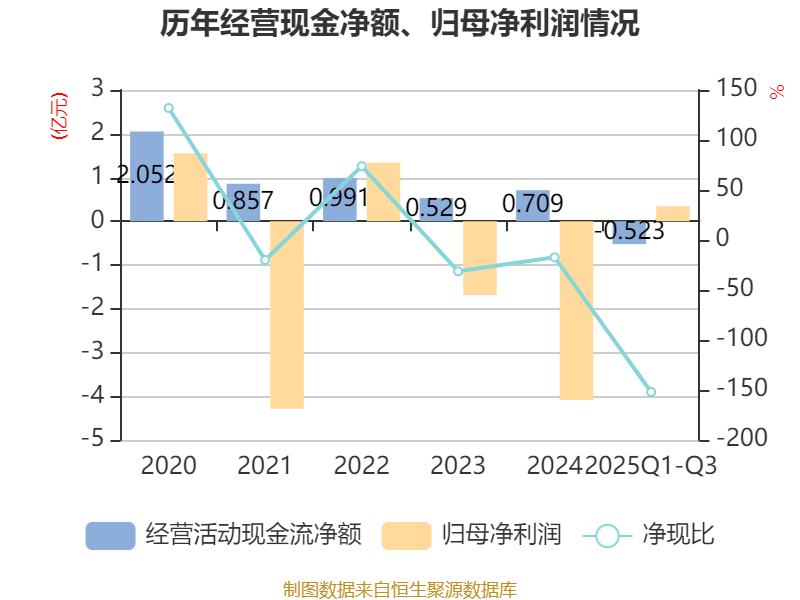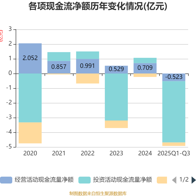2025年前三季度,公司经营活动现金流净额为-5228.71万元,同比减少4637.26万元;筹资活动现金流净额-2375.35万元,同比减少222.23万元;投资活动现金流净额-4.17亿元,上年同期为3500.18万元。