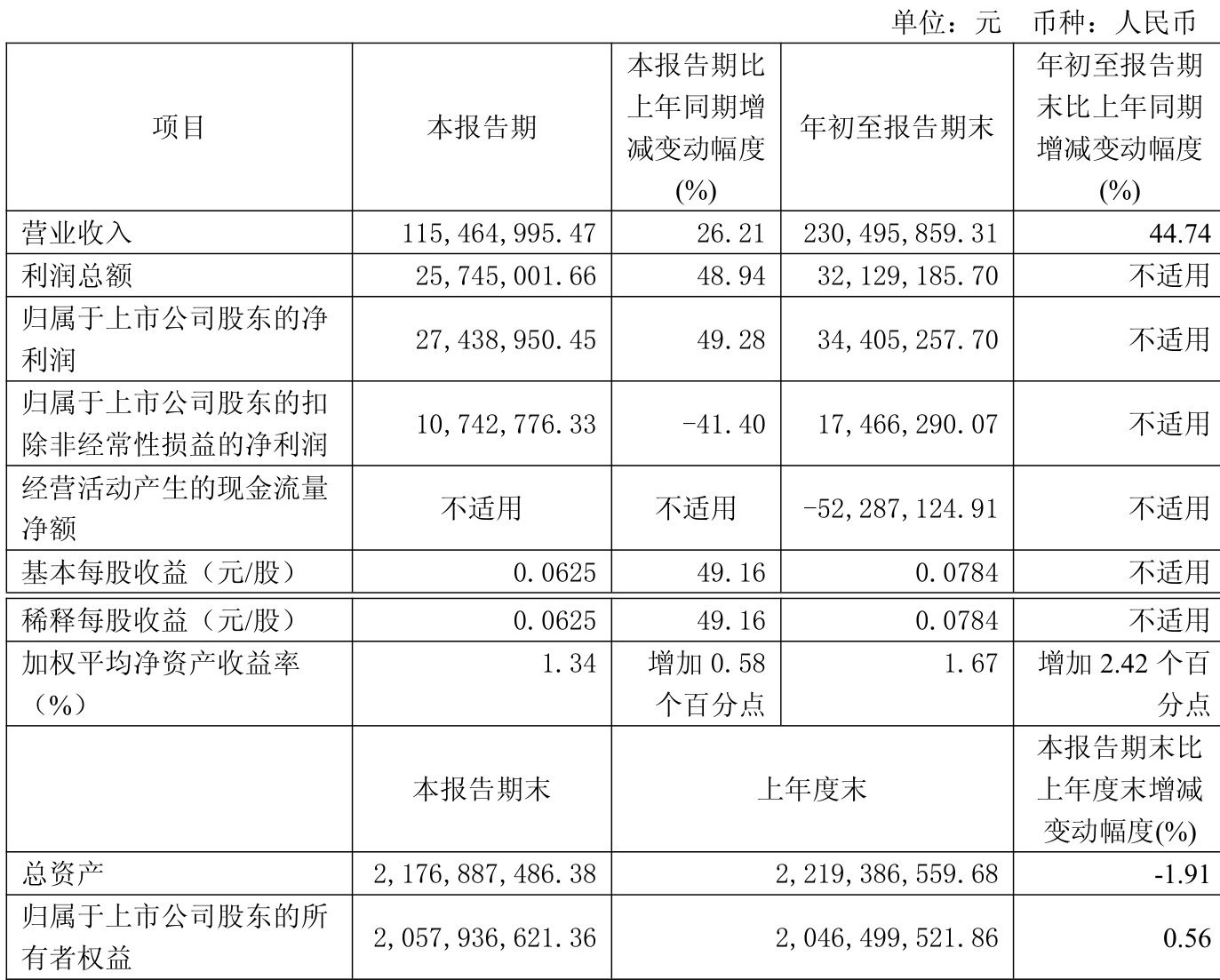 中证智能财讯 *ST国化(600636)10月31日披露2025年第三季度报告。前三季度公司实现营业总收入2.3亿元,同比增长44.74%;归母净利润3440.53万元,同比扭亏;扣非净利润1746.63万元,同比扭亏;经营活动产生的现金流量净额为-5228.71万元,上年同期为-591.46万元;报告期内,*ST国化基本每股收益为0.0784元,加权平均净资产收益率为1.67%。