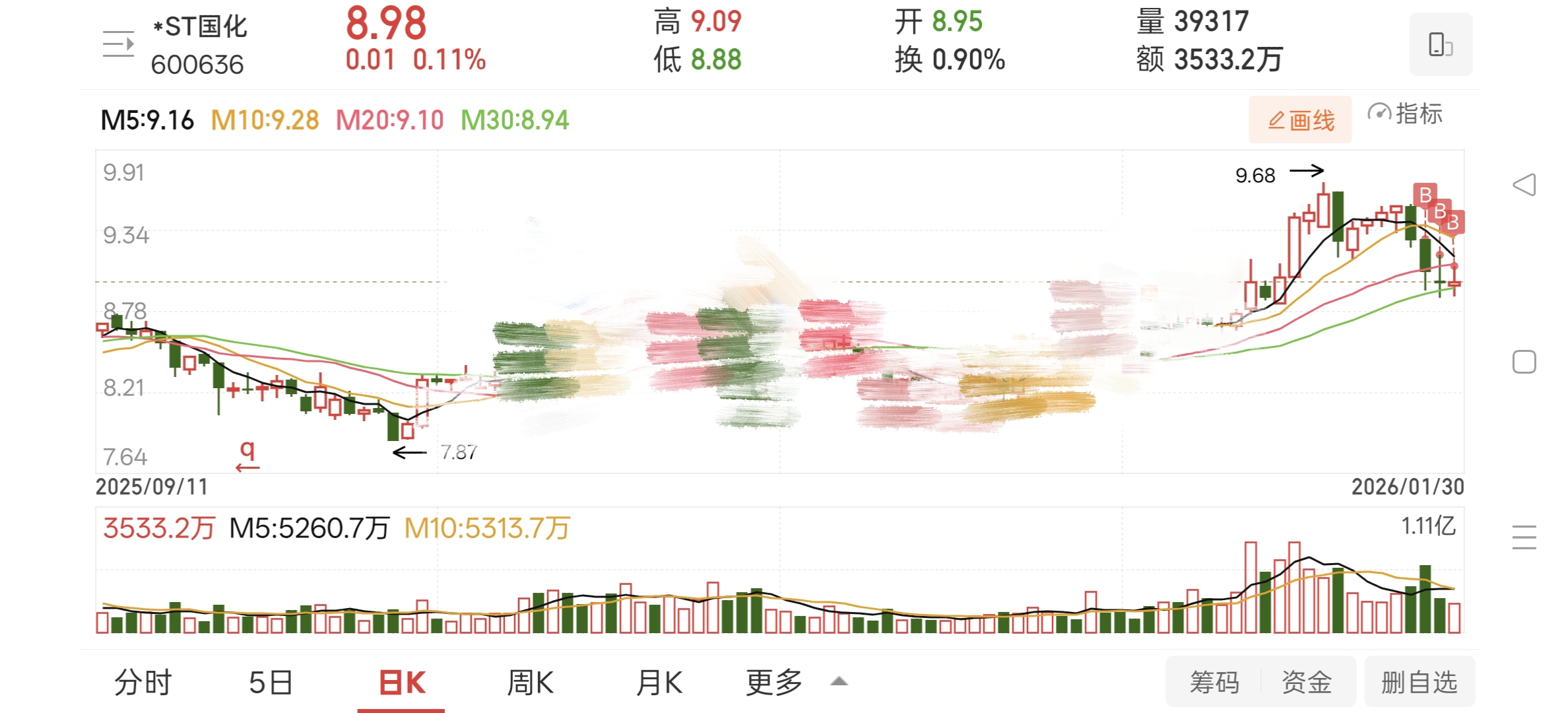 国新文化年度预告出来之前股价连续下跌,老实说心里不慌是不可能的,凡事就怕个万一。万幸的事,自己顶住了压力,年度预告出来之前连着加了三天的仓,目前仓位已满。以后国新文化将无退市风险,后续安静的等摘帽、重组并购就行了。国新文化的股票我将不买、不卖、不T,安静的看主力表演又何尝不是一种幸福。