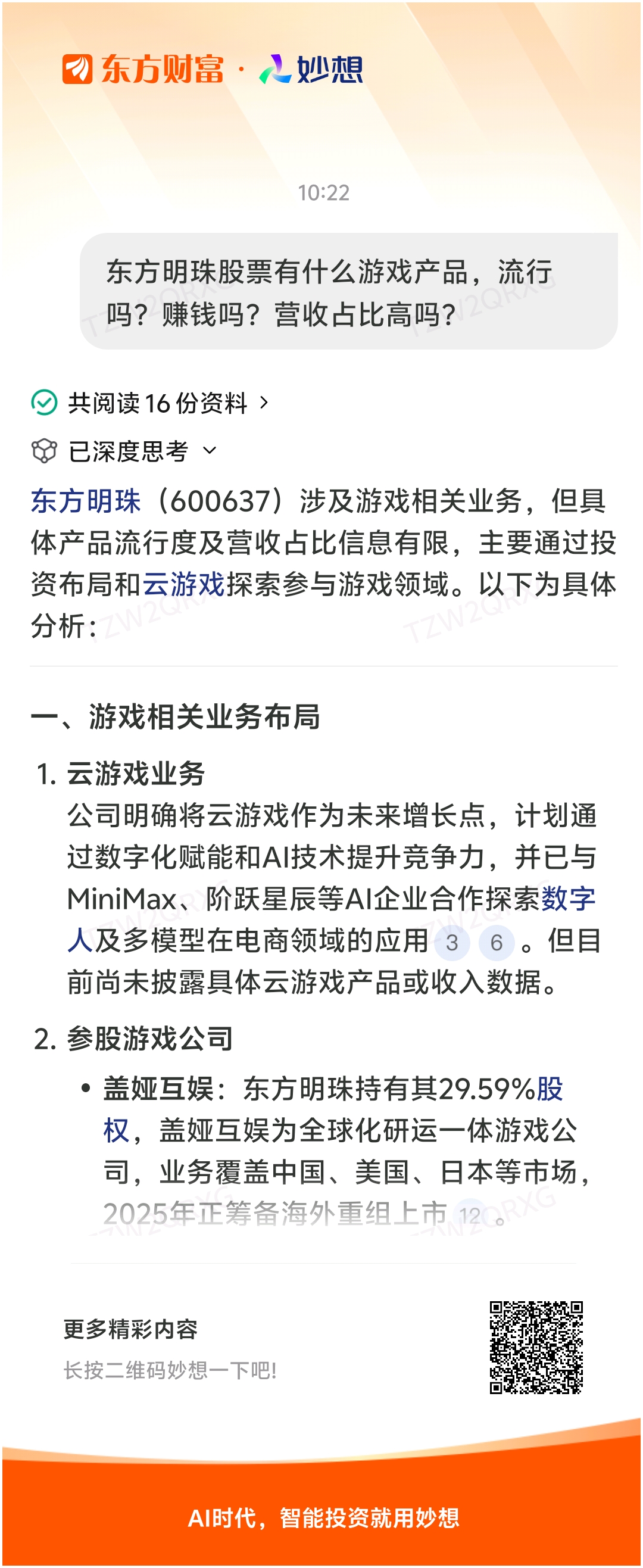#@妙想,你怎么看?# 妙想一下:东方明珠股票有什么游戏产品,流行吗?赚钱吗?营收占比高吗?