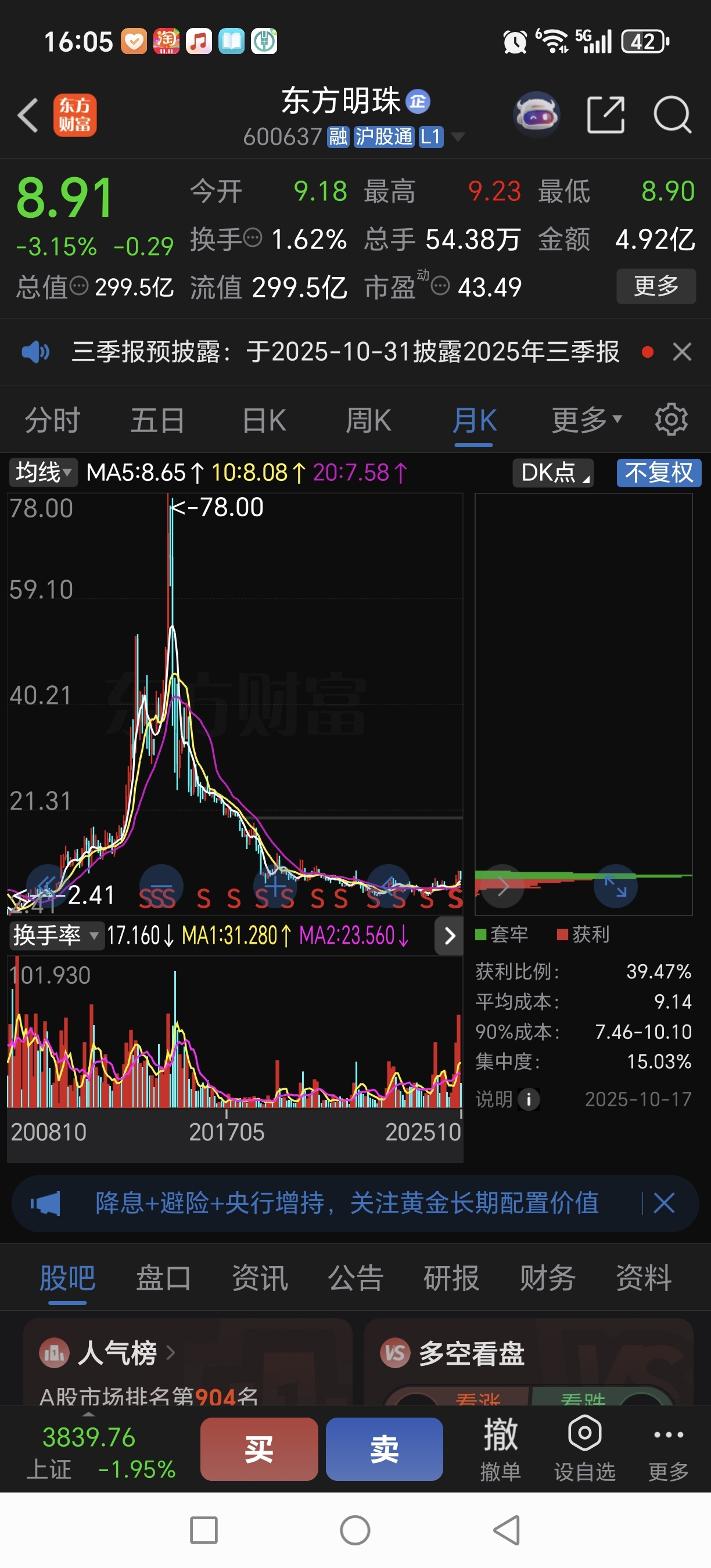 $东方明珠(SH600637)$ 历史78元,跌到9元,净资产9元,怕什么?