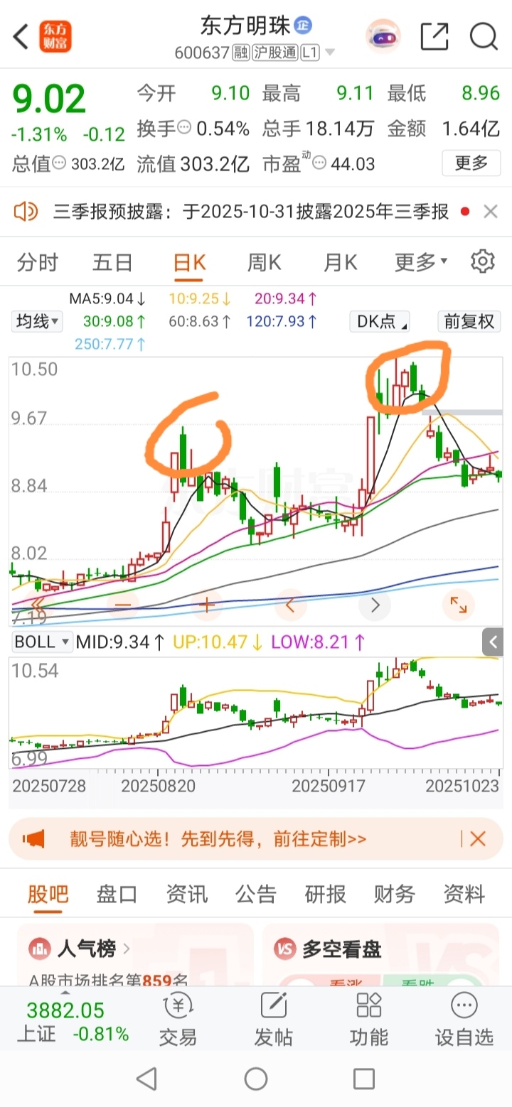 $东方明珠(SH600637)$ 这波上涨两个高点买进的统统套牢了!跌到下轨回到起点不是梦…