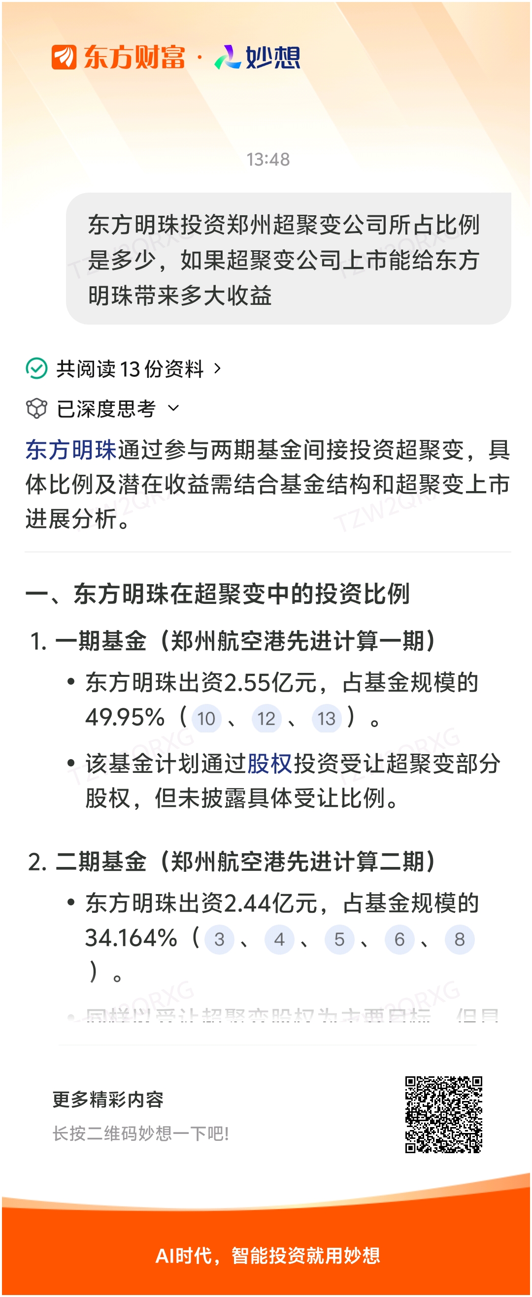 #@妙想,你怎么看?# 妙想一下:东方明珠投资郑州超聚变公司所占比例是多少,如果超聚变公司上市能给东方明珠带来多大收益