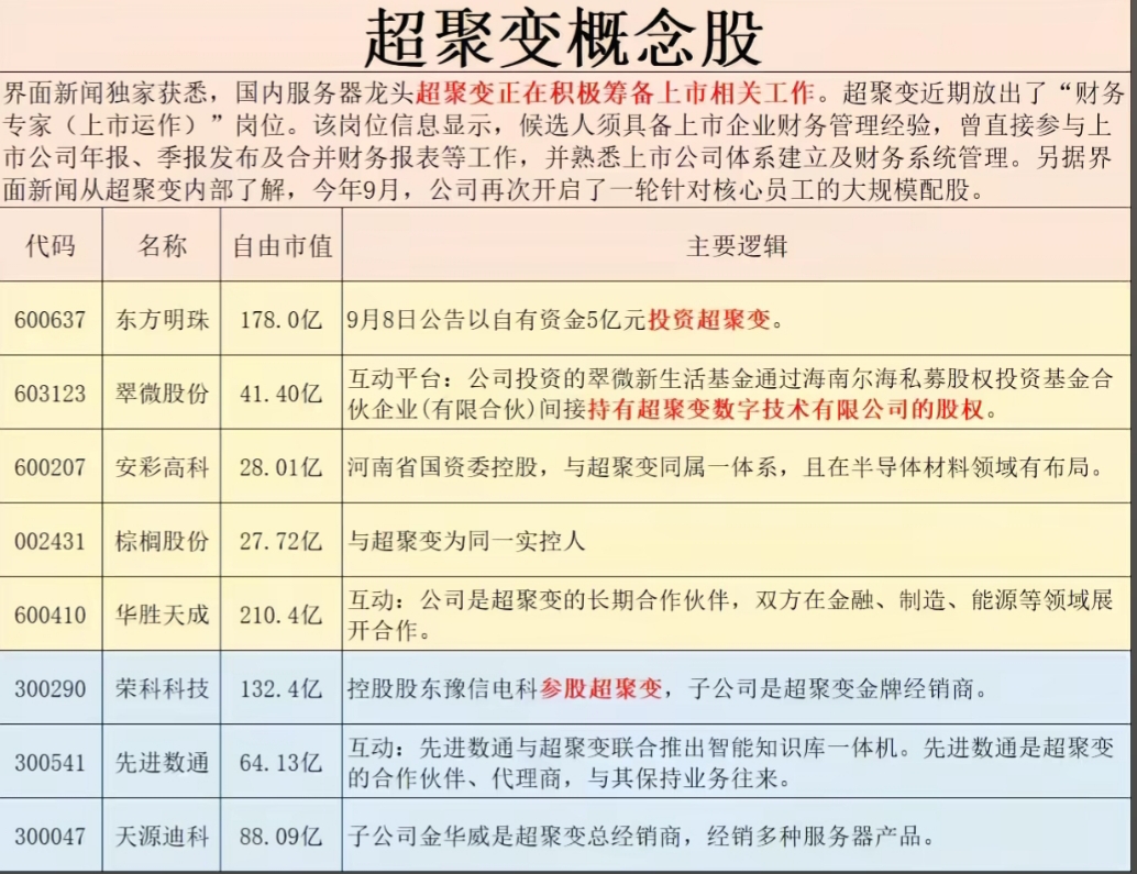 $东方明珠(SH600637)$ $棕榈股份(SZ002431)$ $安彩高科(SH600207)$ 翠微股份、荣科科技、先进数通、天源迪科、华胜天成、亚康股份。今天超聚变概念全部冲高回落,周一能发酵大涨吗? 还是会和新凯莱一样熄火很快