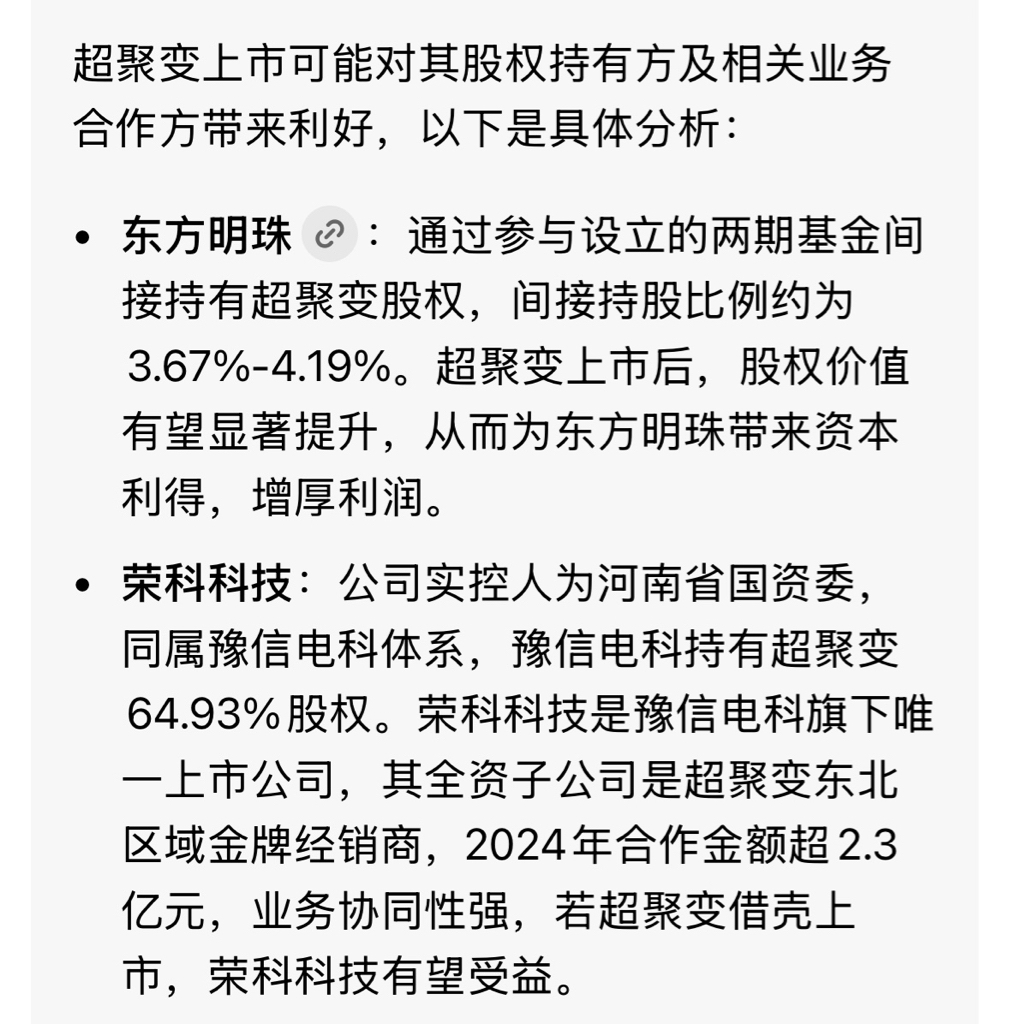 $东方明珠(SH600637)$ $荣科科技(SZ300290)$ $博实股份(SZ002698)$ 真正持有超聚变股份的其实只有东方明珠,但是荣科科技和超聚变同一个东家,所有也算概念股,为什么加上博实股份呢?因为博实股份实控人有哈工大的院士、有人形机器人、有思哲睿手术机器人、还有量子计算机、高温作业机器人、智能训练机器人等。总之东方明珠、博实股份、荣科科技都是数一数二的科技牛股。
