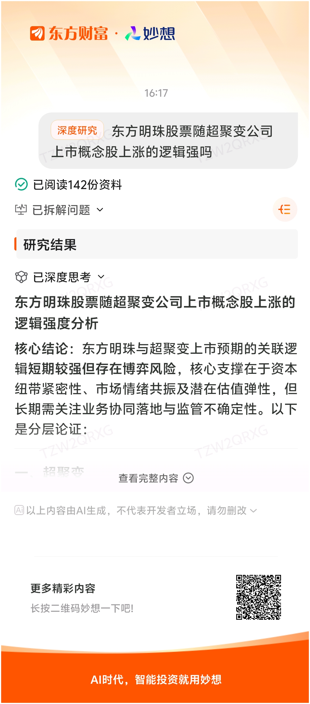 #@妙想,你怎么看?# 妙想一下:东方明珠股票随超聚变公司上市概念股上涨的逻辑强吗