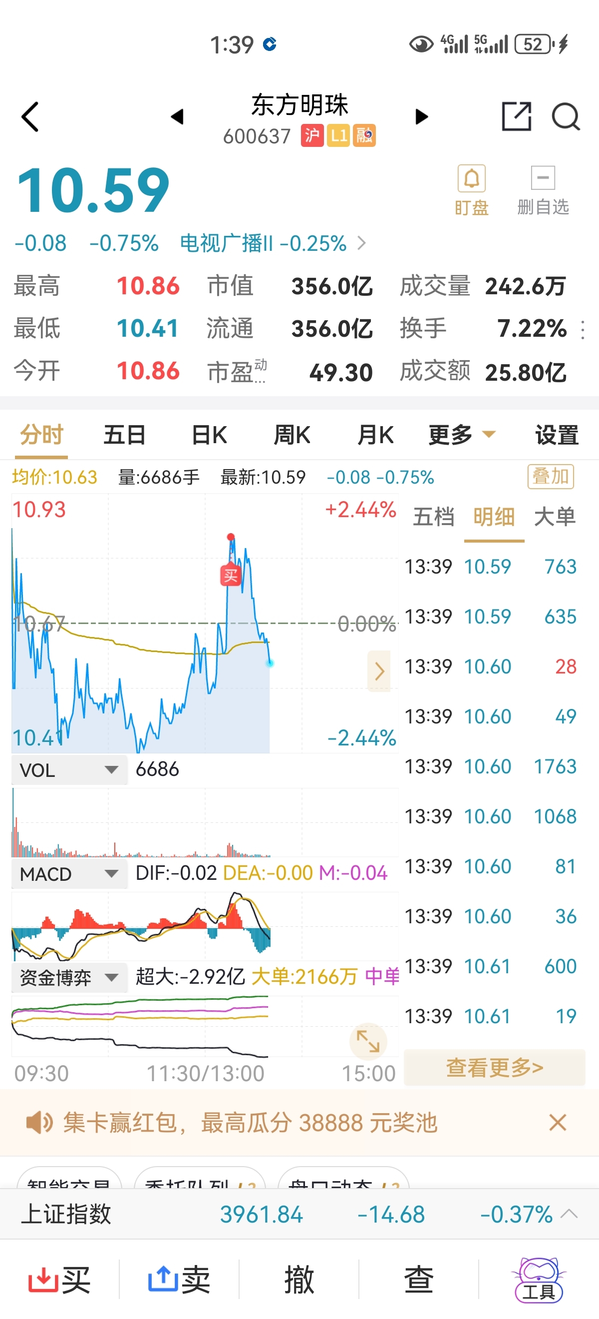 $东方明珠(SH600637)$ 我就买了一手 天塌啦 哈哈