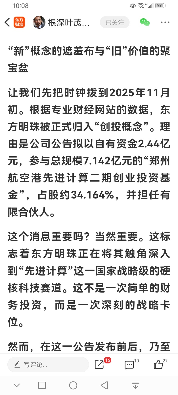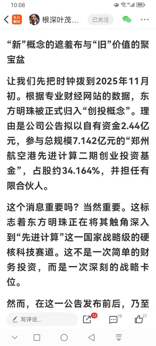 让我们先把时钟拨到2025年11月初。根据专业财经网站的数据,东方明珠被正式归入“创投概念”。理由是公司公告拟以自有资金2.44亿元,参与总规模7.142亿元的“郑州航空港先进计算二期创业投资基金”,占股约34.164%,并担任有限合伙人。