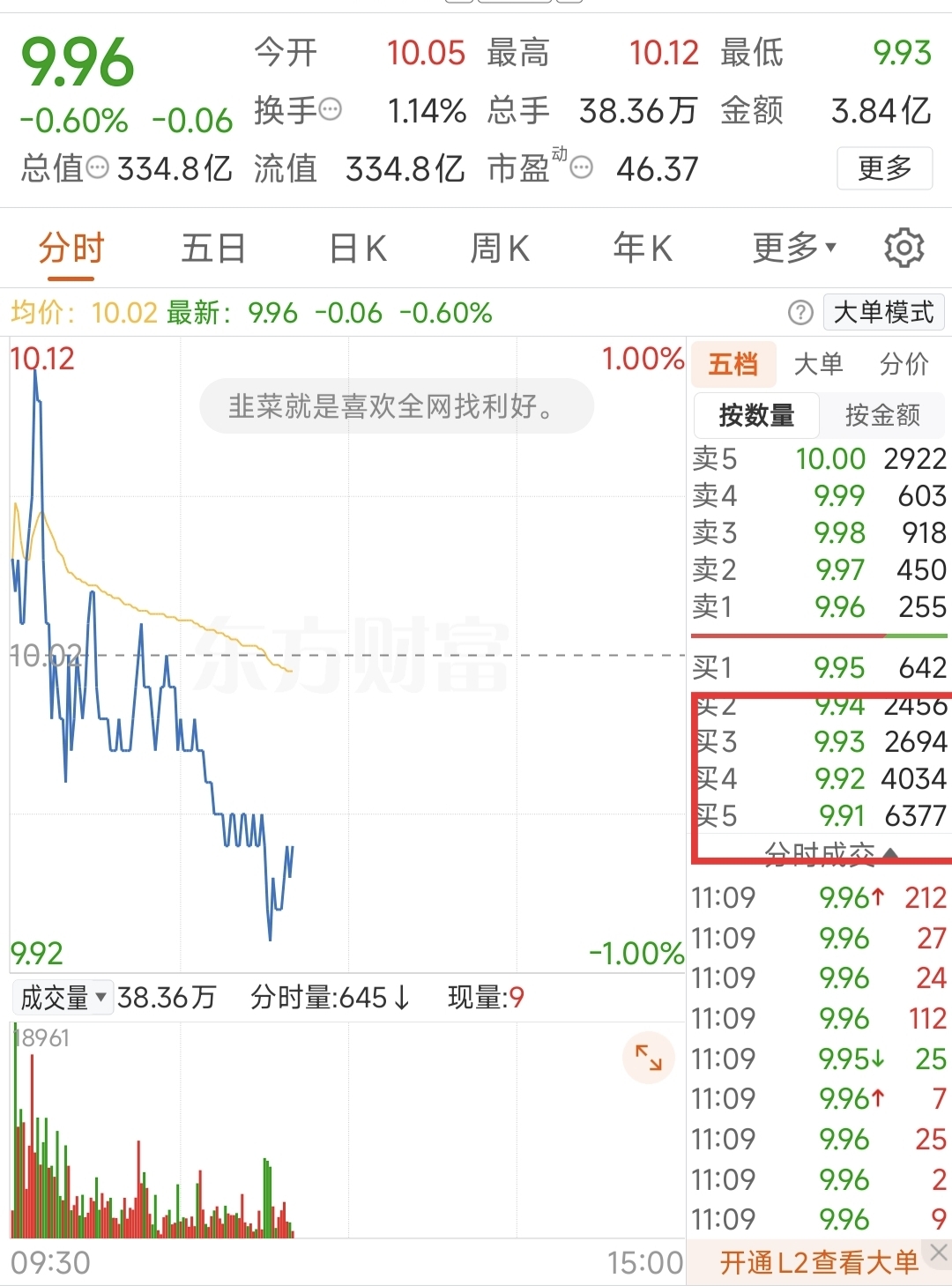 看见这托单就怕,托单必破,定律来的,破了之后只会越托越低,早盘托单9.95破了吧