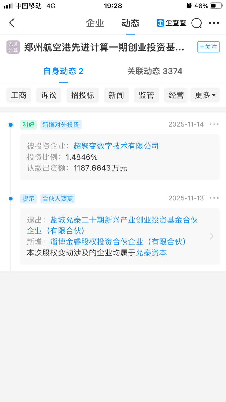 超聚变数字技术有限公司股权变更已完成。郑州航空港先进计算一期创业投资基金和二期也