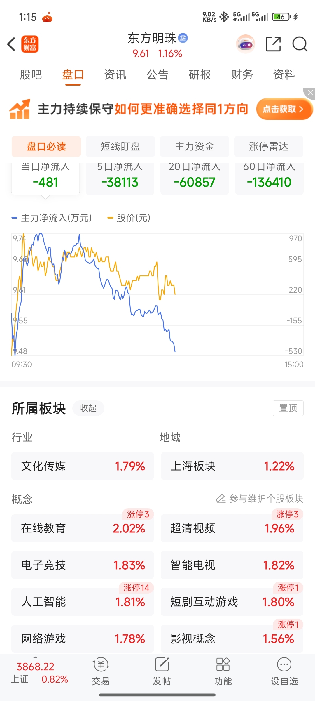 $东方明珠(SH600637)$ 怎么每天不是在砸,就是在砸的路上,每天净流出,今天大盘都是净流入的,就连任何一个板块都没跑得过