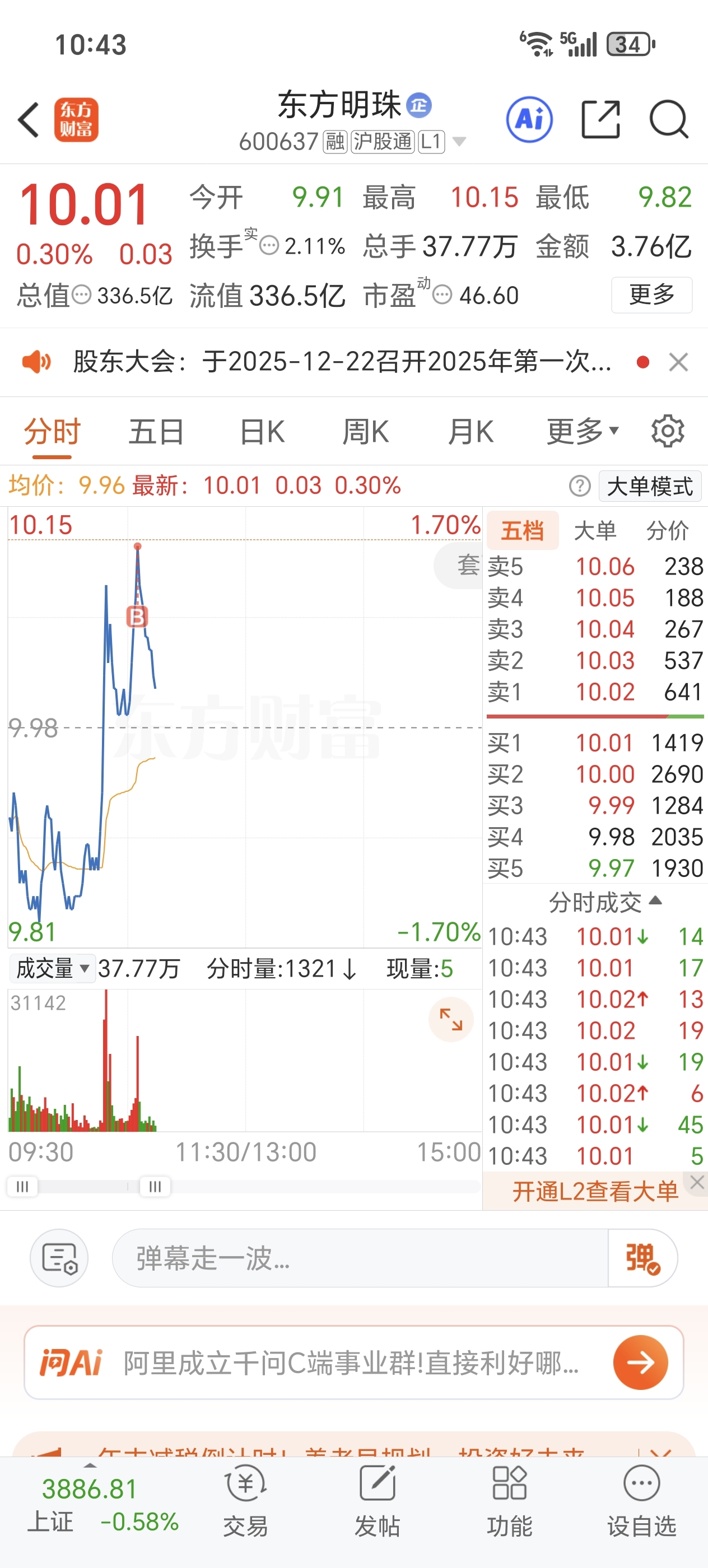$东方明珠(SH600637)$ 挂起我啦