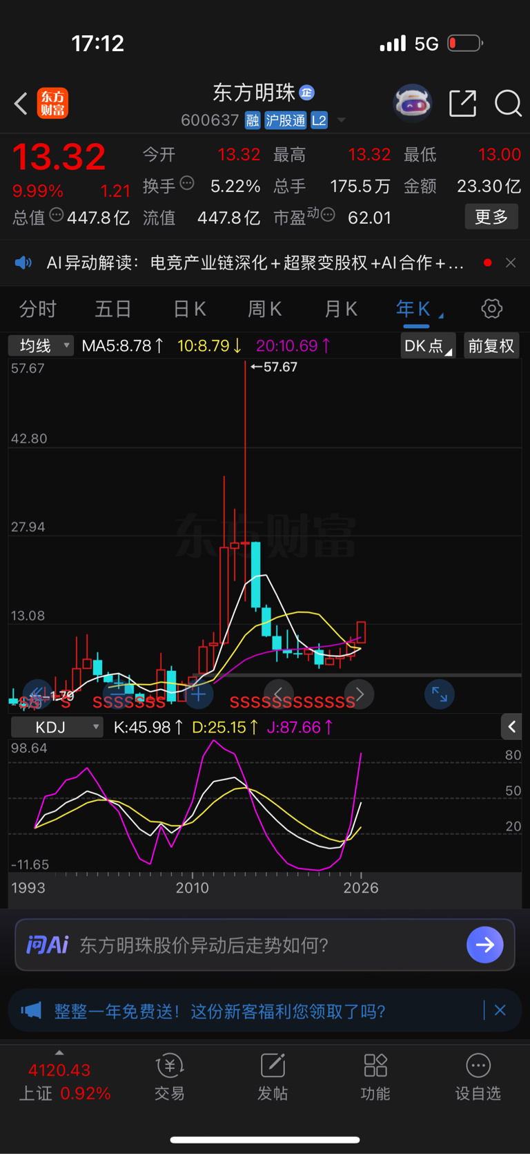 $东方明珠(SH600637)$ 年K线KDJ才刚刚金叉呀!!!!!
