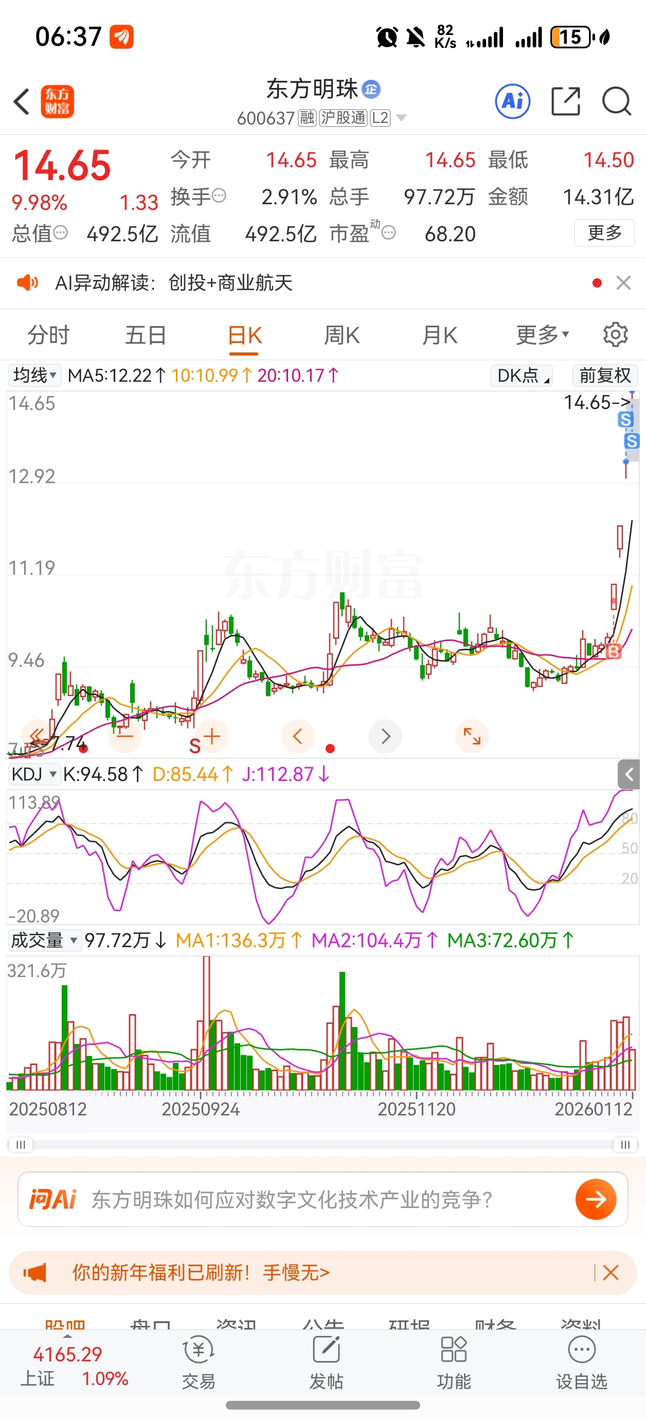 $东方明珠(SH600637)$ 3板清仓了,落袋为安,明天估计要开板,大盘这么火热估计开板也杀不下去,祝留下的发财