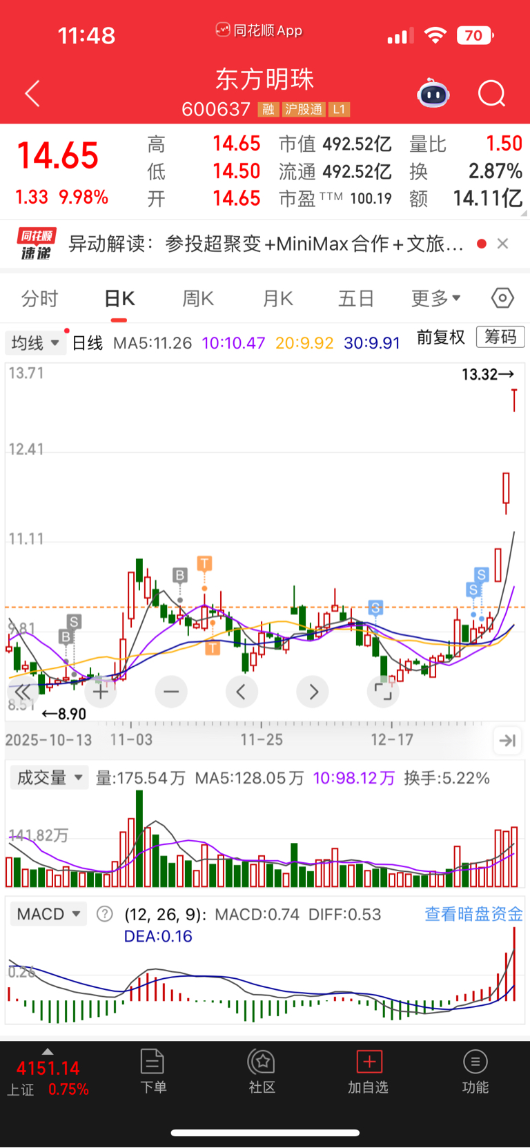 $东方明珠(SH600637)$ 本来有5000股,被主力洗了两个月,起飞前剩1000股