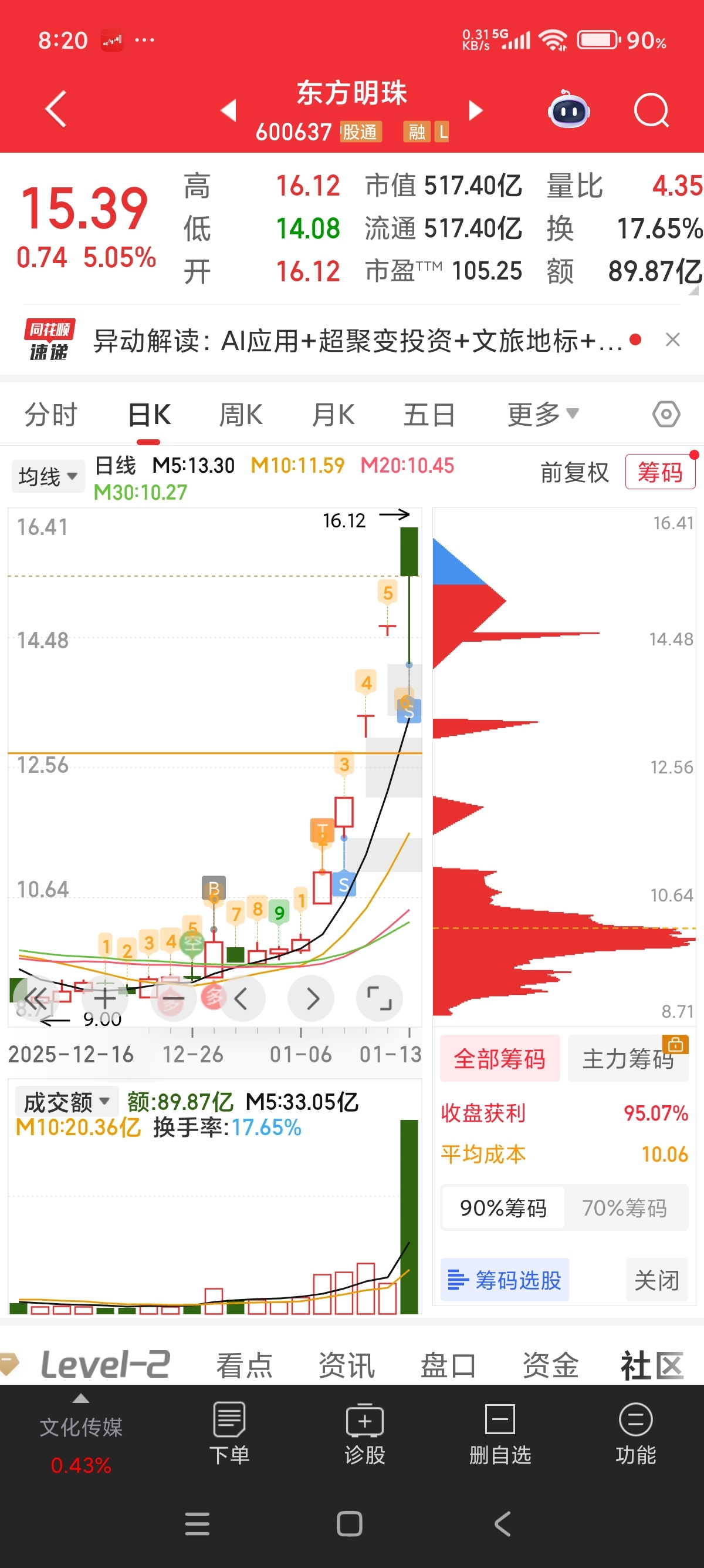 $东方明珠(SH600637)$ 感谢主力,落袋为安了,后面的兄弟继续加油