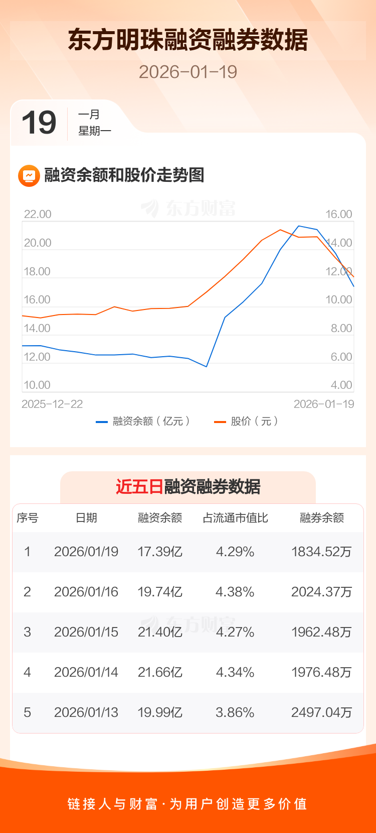交易所最新数据显示,东方明珠于2026年1月19日获融资买入4.61亿元,融资偿还6.96亿元,当日融资净偿还2.35亿元。目前,该股融资余额17.39亿,占流通市值比例为4.29%。