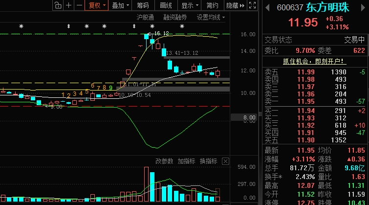 $东方明珠(SH600637)$ 两根支撑一根压力,反弹无量底部未现