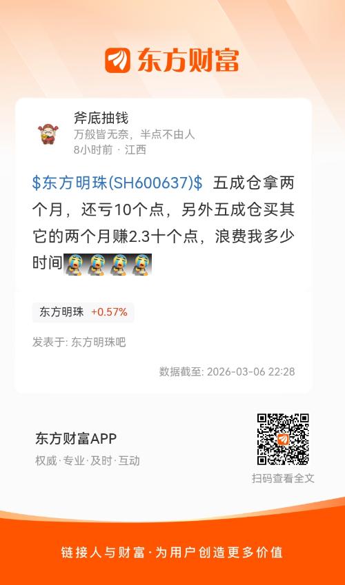 $东方明珠(SH600637)$  五成仓拿两个月,还亏10个点,另外五成仓买其它的两个月赚2.3十个点,浪费我多少时间