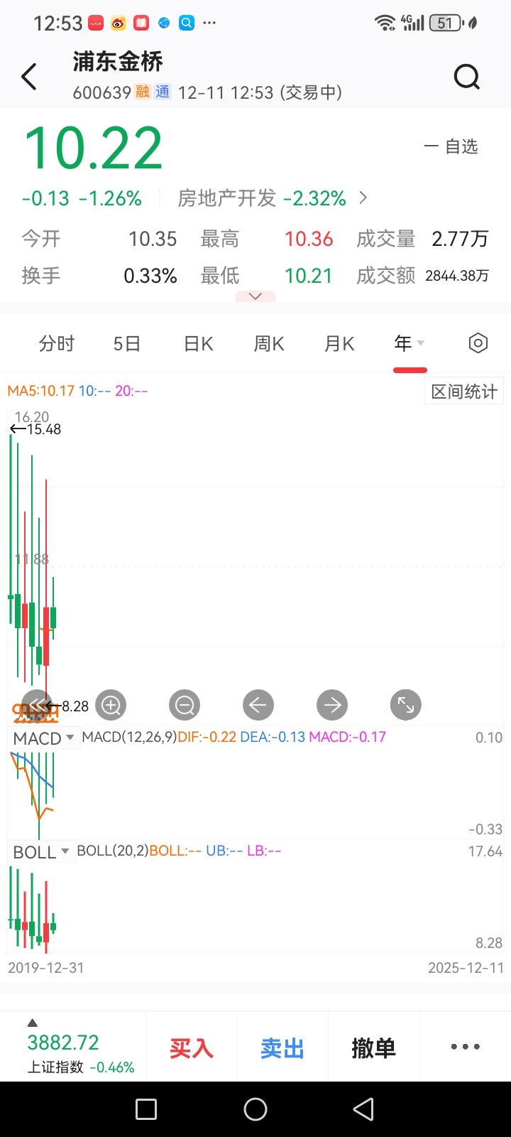 浦东金桥2025年开盘价是11.10元今天股票价格是10.22元跌了一整年。20