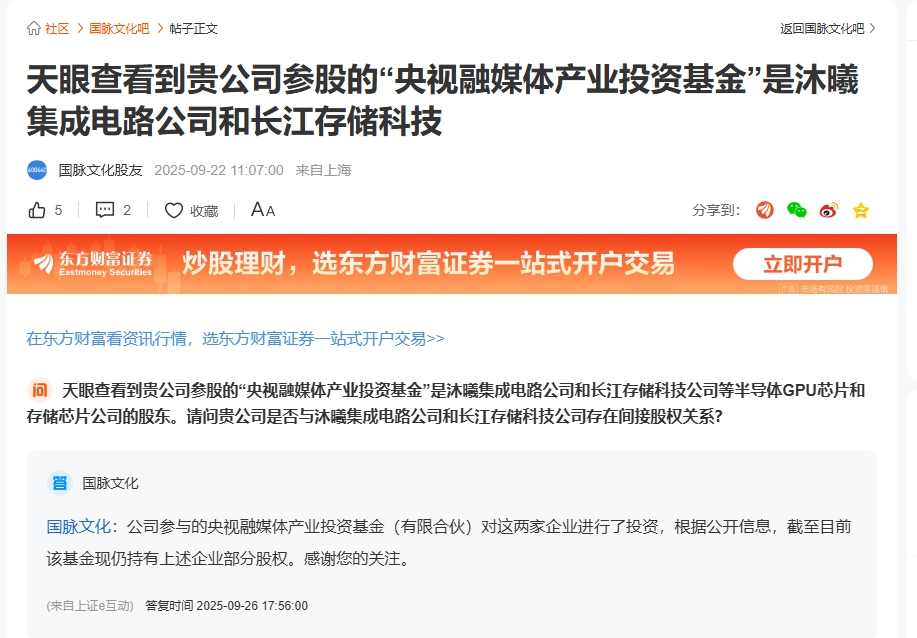 国脉文化通过“央视融媒体产业投资基金”持股沐曦集和长江存储科技