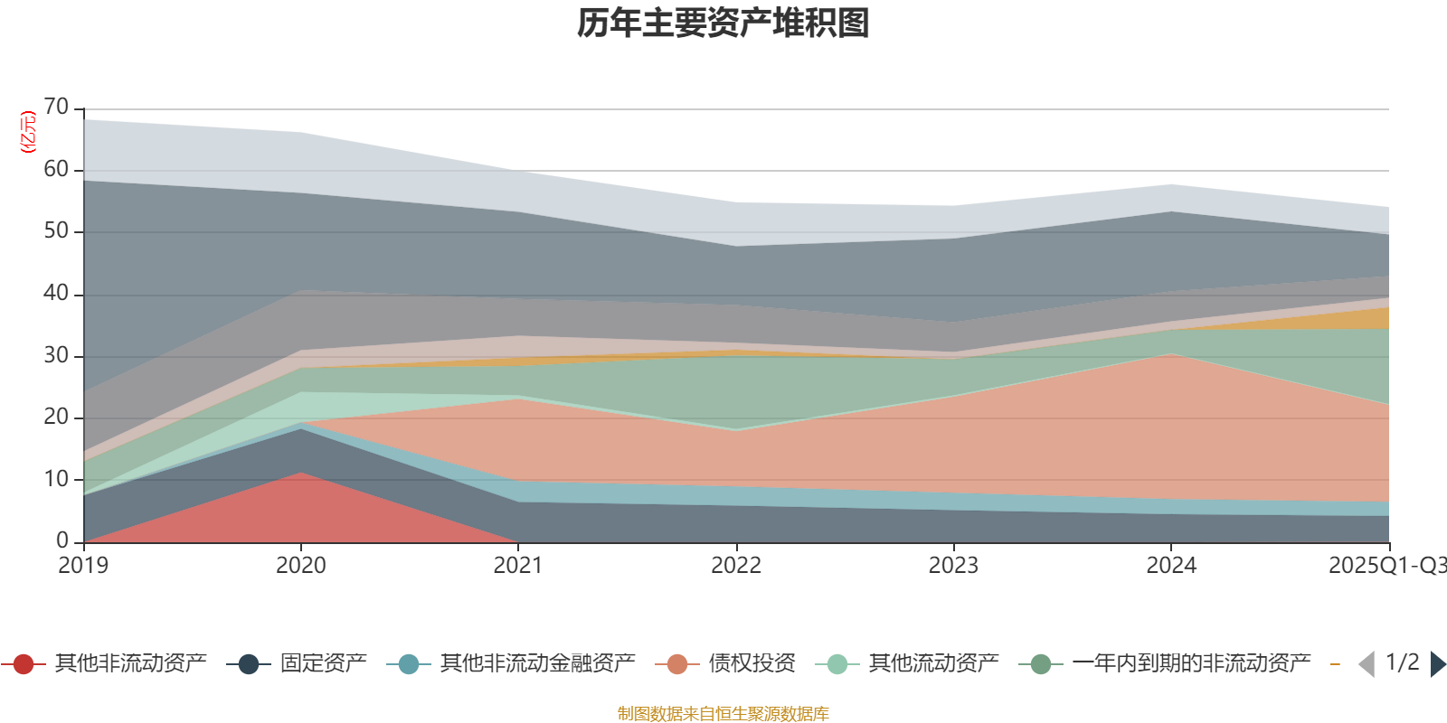 资产重大变化方面,截至2025年三季度末,公司一年内到期的非流动资产较上年末增加221.83%,占公司总资产比重上升15.93个百分点;债权投资较上年末减少33.21%,占公司总资产比重下降11.62个百分点;货币资金较上年末减少47.98%,占公司总资产比重下降9.89个百分点;交易性金融资产合计占公司总资产的6.47%,上年末为0。