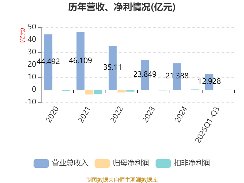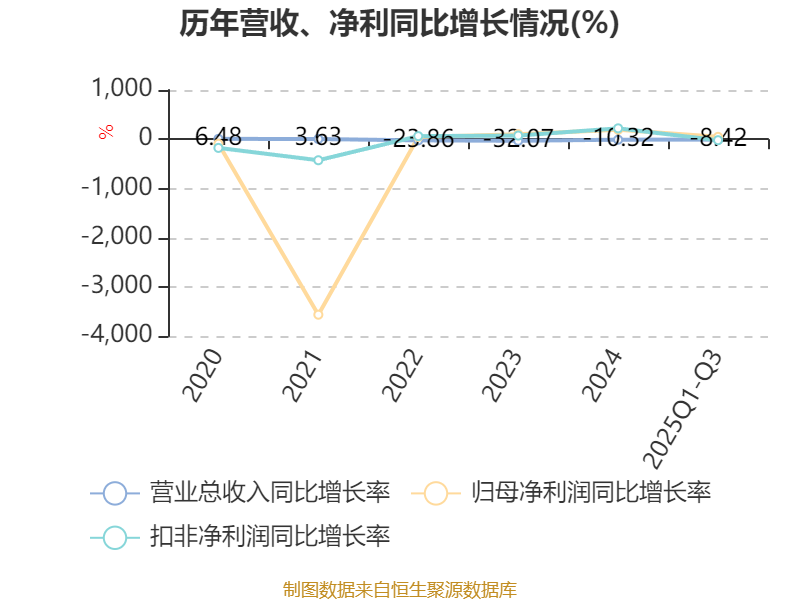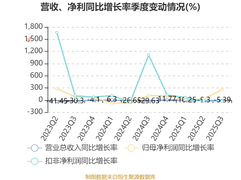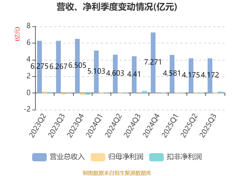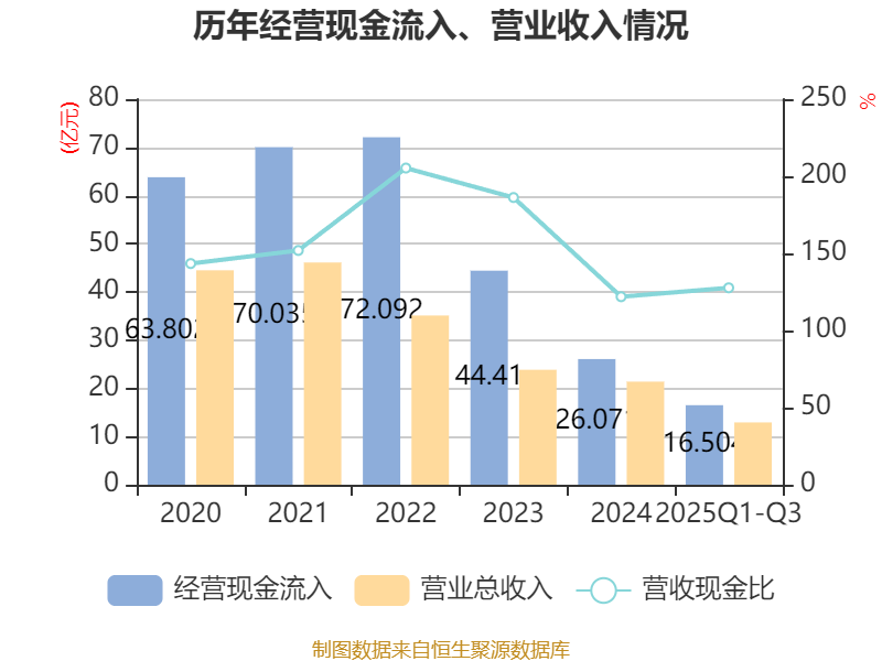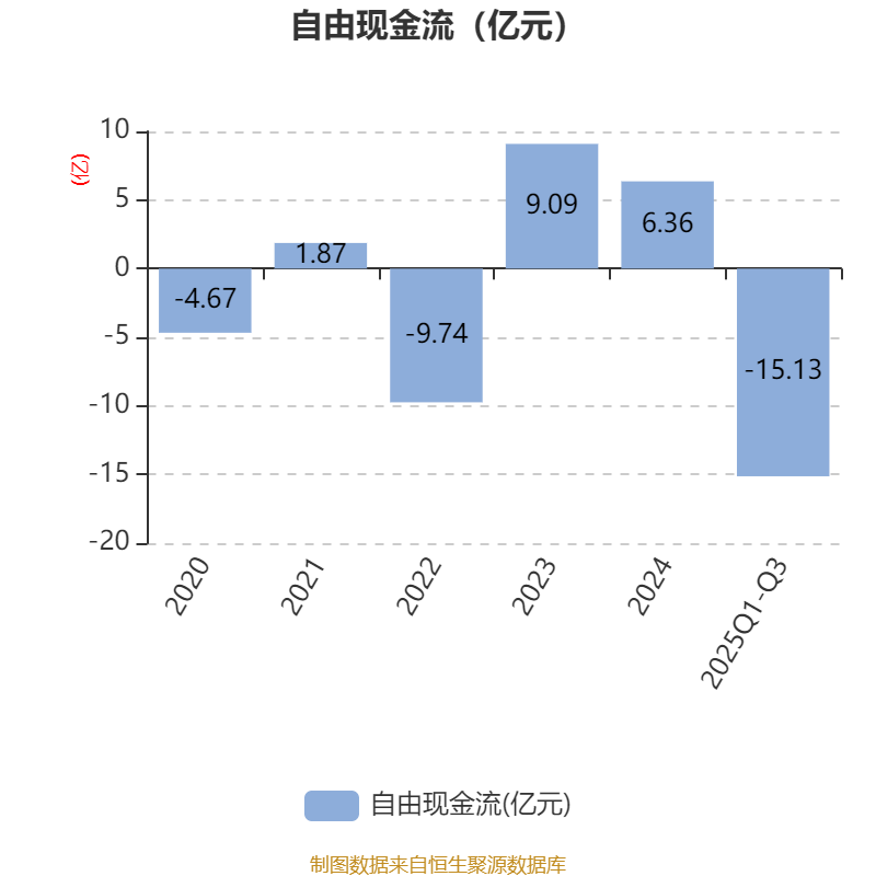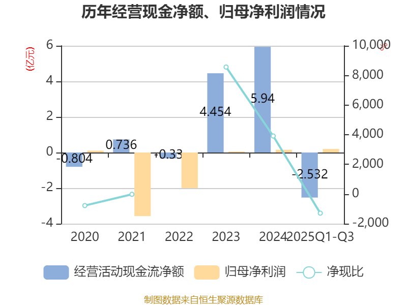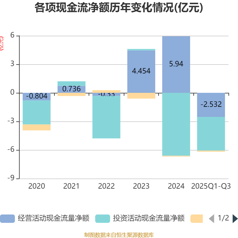 2025年前三季度,公司经营活动现金流净额为-2.53亿元,同比减少4.17亿元;筹资活动现金流净额-1179.7万元,同比减少591.09万元;投资活动现金流净额-3.53亿元,上年同期为-8.5亿元。