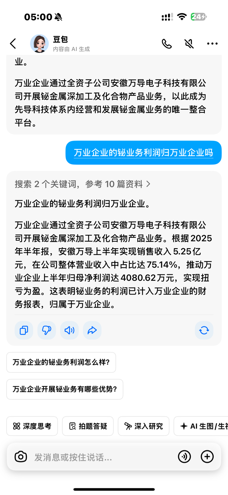 铋是今年开始已经是万业企业的了,半年报利润都体现了