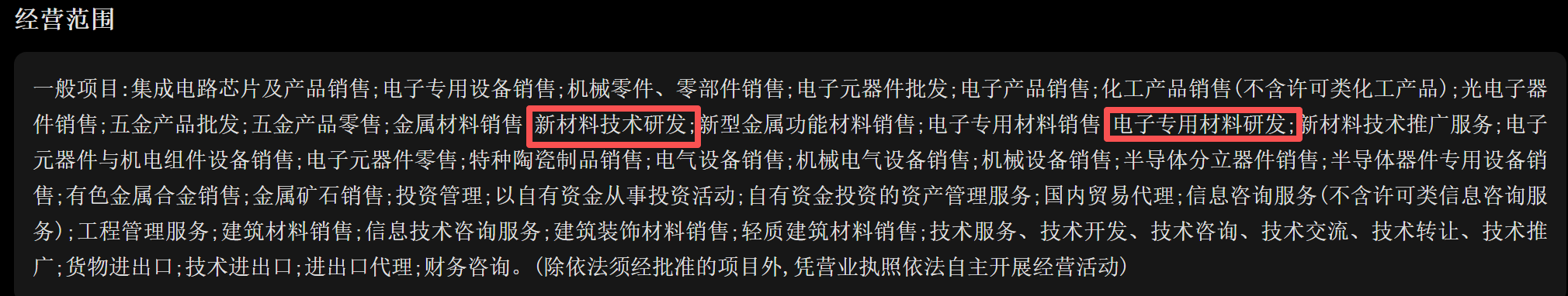 这个公司的经营范围除了新材料技术研发、电子专用材料研发,其他全部都是销售,生产是