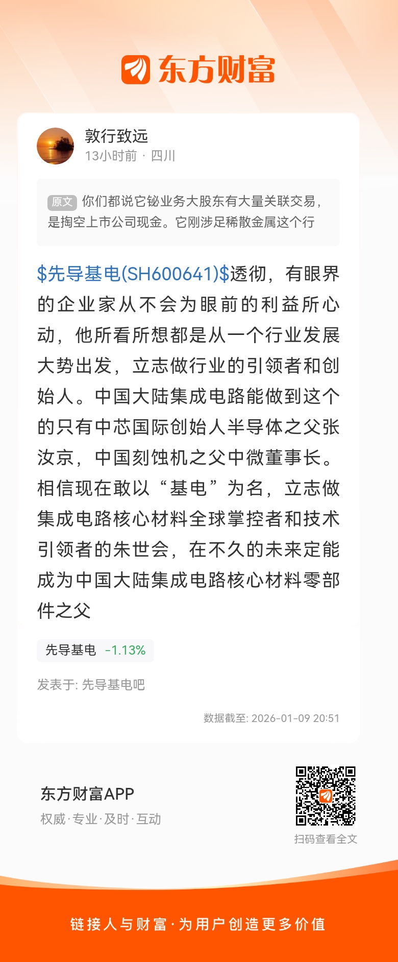 相信领头人//@敦行致远 :$先导基电(SH600641)$透彻,有眼界的企业家从不会为眼前的利益所心动,他所看所想都是从一个行业发展大势出发,立志做行业的引领者和创始人。中国大陆集成电路能做到这个的只有中芯国际创始人半导体之父张汝京,中国刻蚀机之父中微董事长。相信现在敢以“基电”为名,立志做集成电路核心材料全球掌控者和技术引领者的朱世会,在不久的未来定能成为中国大陆集成电路核心材料零部件之父