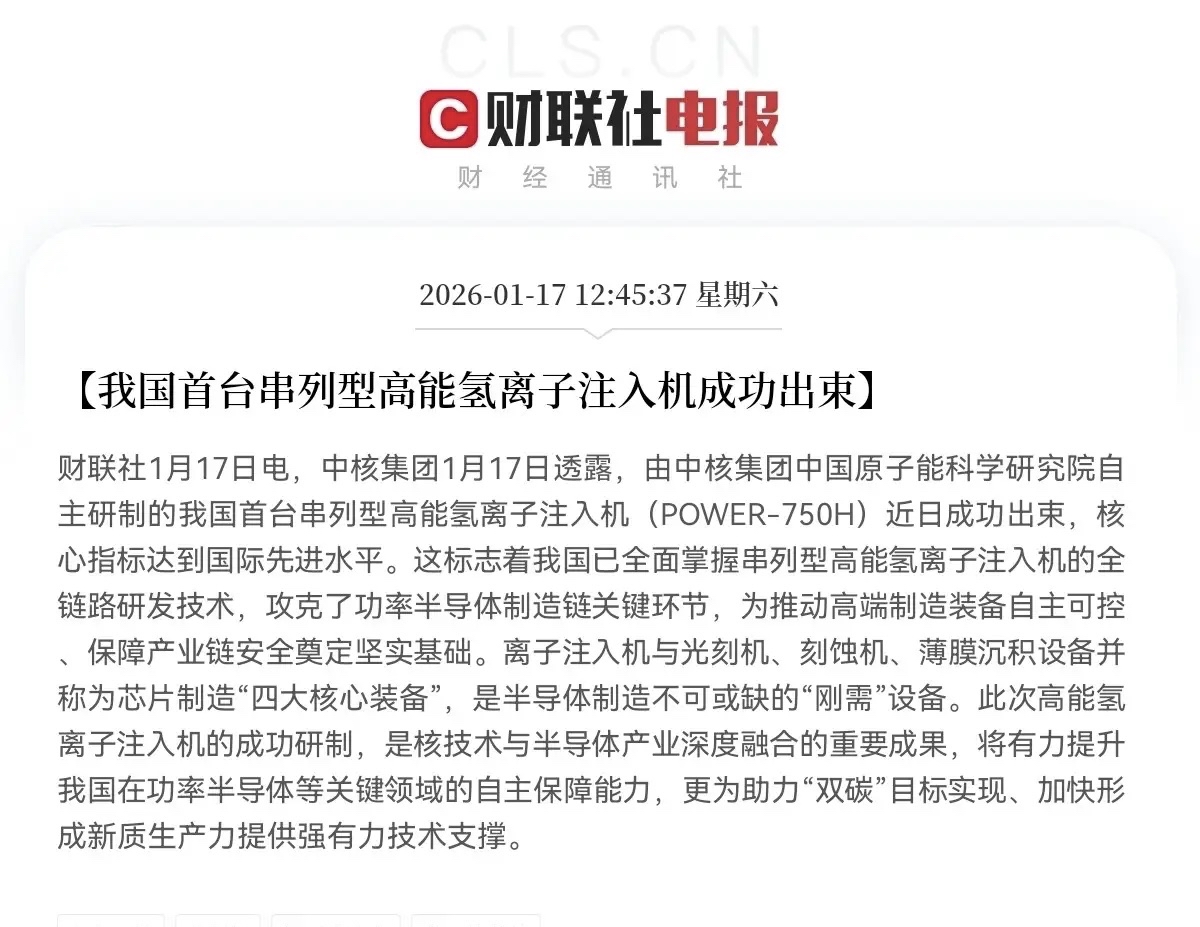 $先导基电(SH600641)$$北方华创(SZ002371)$$华海清科(SH688120)$1月17日,中核集团透露,由其旗下中国原子能科学研究院自主研制的我国首台串列型高能氢离子注入机(POWER-750H)近日成功出束,核心指标达到国际先进水平。该成果标志着我国已全面掌握串列型高能氢离子注入机的全链路研发技术,攻克了功率半导体制造链的关键环节。离子注入机与光刻机、刻蚀机、薄膜沉积设备并称为芯片制造"四大核心装备"。此次突破是核技术与半导体产业深度融合的重要成果,将有力提升我国在功率半导体等关键领域的自主保障能力,并为助力"双碳"目标、加快形成新质生产力提供技术支撑。一、先导基电 600641.SH 旗下凯世通是国产离子注入机龙头,产品覆盖大束流、高能等全系列。凯世通已构建完整的“通用平台+关键技术模块化+系列化产业化发展”技术体系,覆盖大束流、高能、中束流、氢离子及第三代半导体专用机型,并在CIS器件专用大束流机型上填补国内空白。 其设备已通过国内多家主流晶圆厂验证,应用于逻辑、存储、功率、CIS图像传感器等领域。订单与交付:自2020年首单以来,累计收获订单近60台,金额超14亿元,其中50%以上为重复订单,完成产线交付超40台。 客户覆盖:截至2025年上半年,存量客户已突破12家,包括中芯国际、华虹半导体等头部企业,且持续获得重复订单与新客户认可。二、北方华创 002371.SZ 国内半导体设备龙头,2025年宣布进军离子注入设备市场,发布首款机型Sirius MC 313。 公司持续布局新技术领域,在离子注入设备的束流控制、调束算法、剂量精准控制等关键技术方面取得多项突破,自主开发出具备能量精度高、剂量均匀性好、注入角度控制精度高等特性的高端离子注入设备。三、华海清科 688120.SH 旗下芯嵛半导体芯嵛半导体自主研发的12英寸大束流离子注入机已批量交付国内多家集成电路制造头部企业。