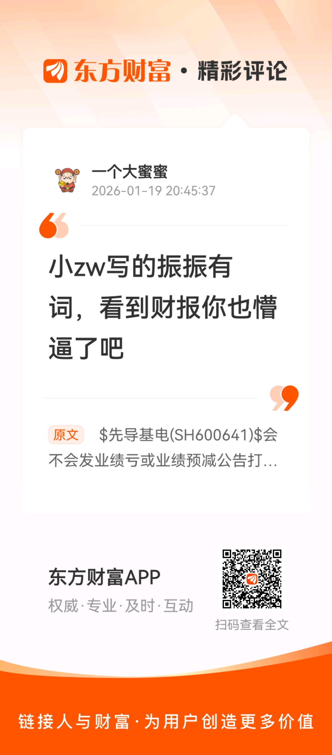 温馨提示: 1.根据《证券法》规定,禁止编造、传播虚假信息或者误导性信息,扰乱证券市场;2.用户在本社区发表的所有资料、言论等仅代表个人观点,与本网站立场无关,不对您构成任何投资建议。用户应基于自己的独立判断,自行决定证券投资并承担相应风险。《东方财富社区管理规定》