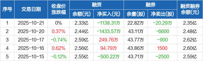 融资方面,当日融资买入538.88万元,融资偿还1677.18万元,融资净偿还1138.31万元。融券方面,融券卖出0股,融券偿还20.29万股,融券余量22.82万股,融券余额184.84万元。融资融券余额合计2.35亿元。