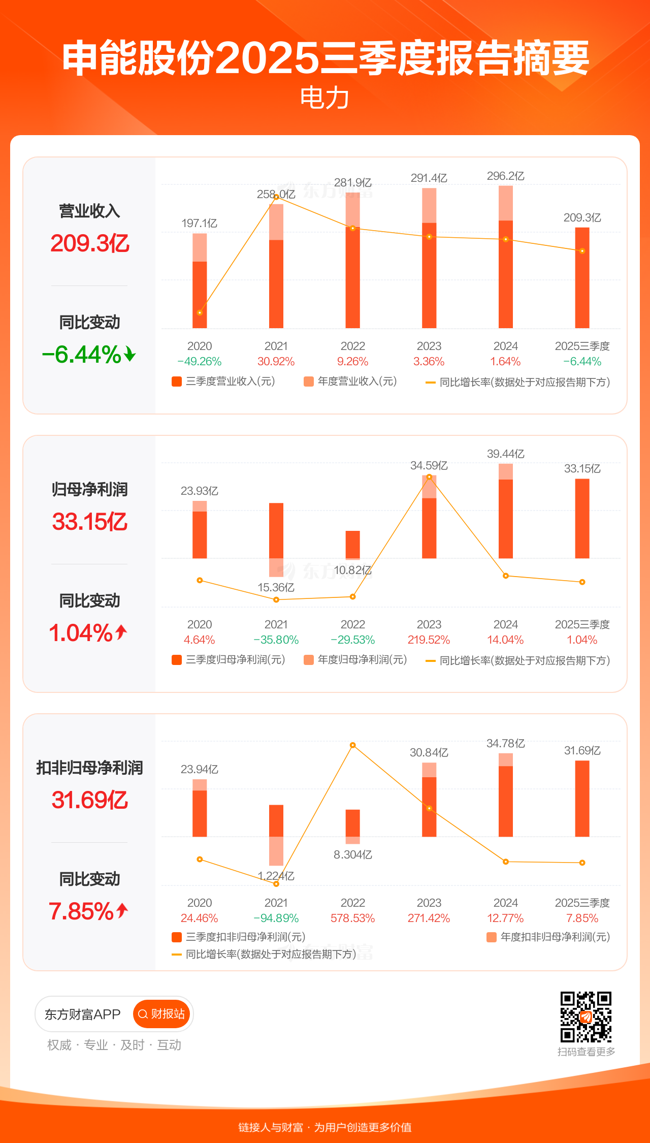 申能股份10月31日发布2025年三季报显示,公司前三季实现营业收入209.32亿元,同比下滑6.44%;归母净利润33.15亿元,同比增长1.04%;扣非归母净利润31.69亿元,同比增长7.85%。