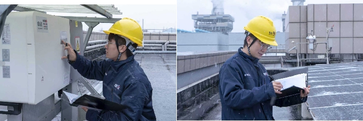 在申能崇明发电,设备管理部工作人员在屋顶光伏区域进行巡检,重点排查光伏逆变器运行状态和遮雨棚积雪情况等可能引发的发电效率下降和设备安全隐患,第一时间记录处置,全力确保极端天气下光伏电站可靠运行。