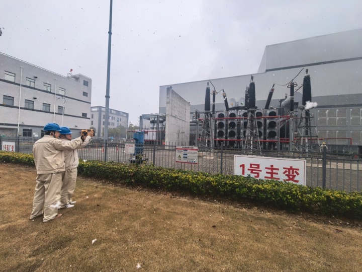 在申能奉贤热电,设备管理部工作人员主动加强恶劣天气下的设备检查,对厂区主变进行红外成像检测及局部放电检测。