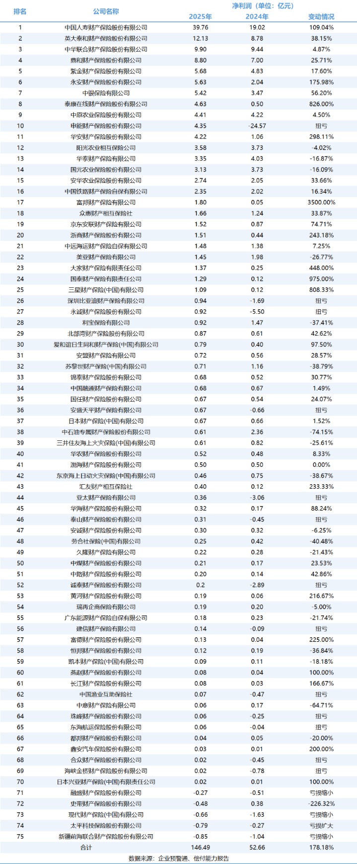 2025年财产险行业的盈利能力显著增强,已公布数据的75家财险公司合计实现净利润约146.49亿元,同比增长178.18%,呈现强劲反弹趋势。