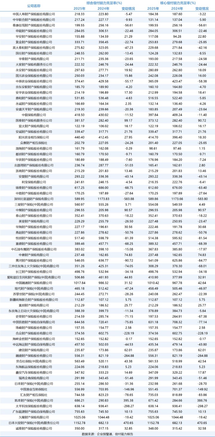 财产险公司的偿付能力指标在2025年总体保持稳定,绝大部分公司的资本充足水平远高于监管要求。