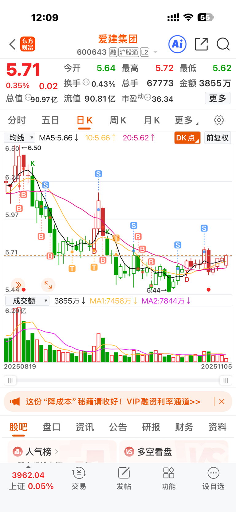 $爱建集团(SH600643)$ 乖乖狠呢连涨4天,我6.5进来的一路跌一路加一路T还是认输累啊。
