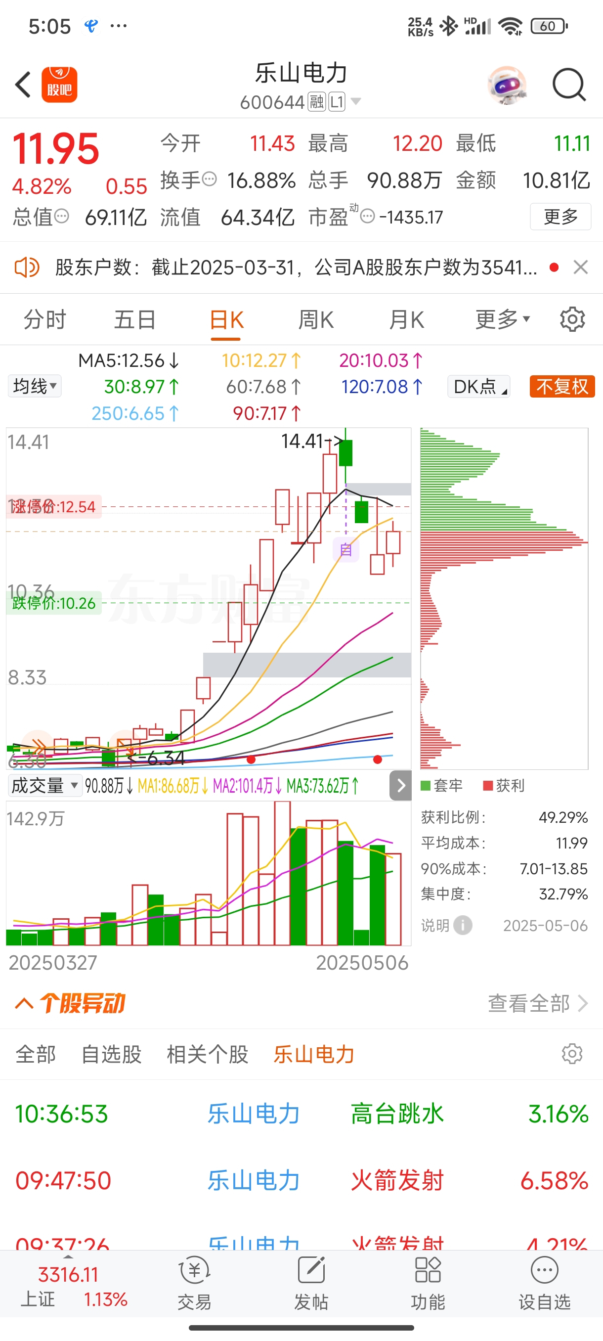 $乐山电力(SH600644)$ 今天11.2进的感觉明天可以出了,虽然反弹了一下近5个点,但是感觉趋势已经往下了,今天还被华银卡位了,量能还没昨天高,今天其实很容易涨停,没多少人看好,随便砸一下就砸了11.7去了,感觉明天随便弄一下还是得下去,明天让我12块钱出去就行了