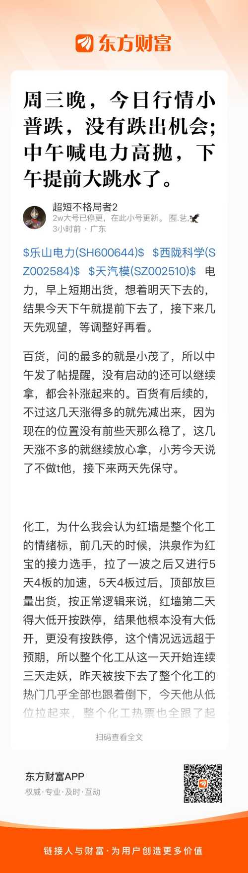$乐山电力(SH600644)$ $西陇科学(SZ002584)$ $天汽模(SZ002510)$ 电力,早上短期出货,想着明天下去的,结果今天下午就提前下去了,接下来几天先观望,等调整好再看。