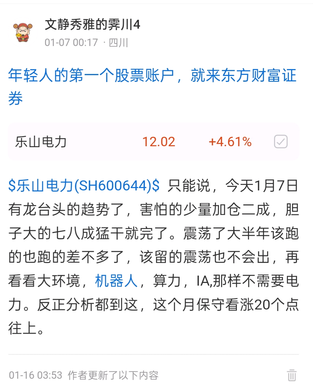 $乐山电力(SH600644)$ 乐山电力坚持看好,此贴为证,持到月底,中期有短占的的一二天回落,预估二三个点,拿稳了。