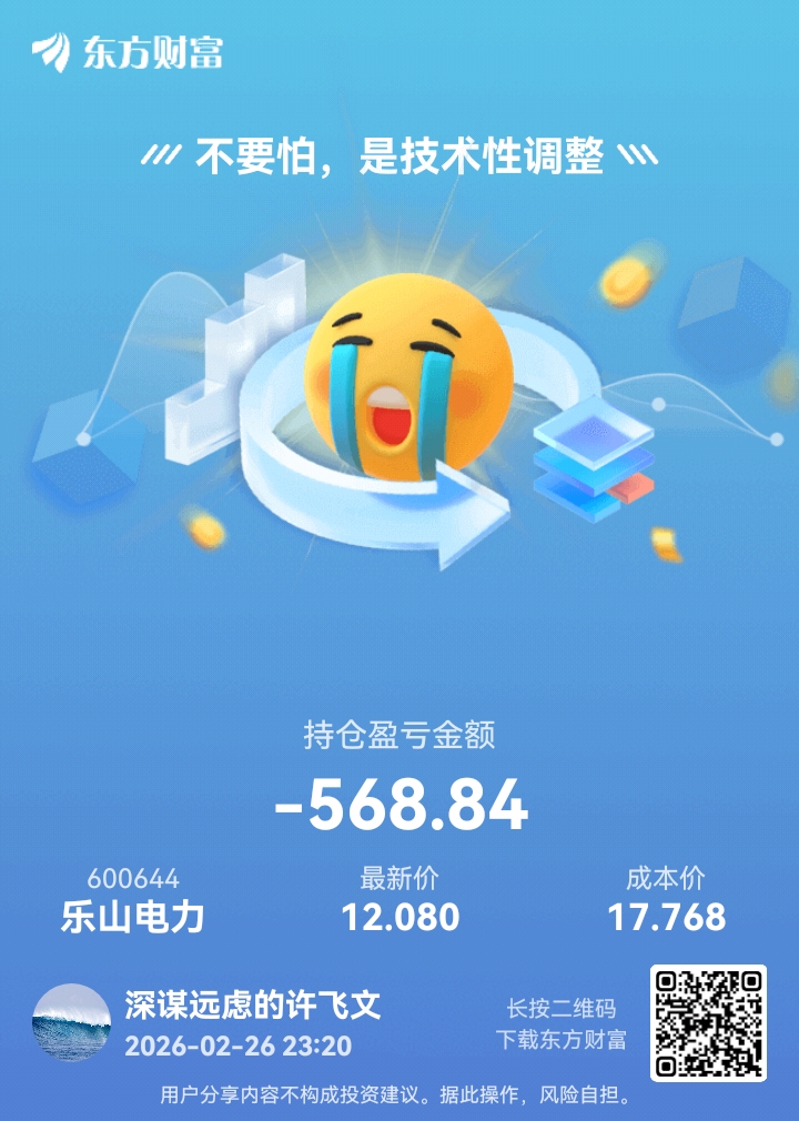 $乐山电力(SH600644)$ 100股亏损五百多,每股亏损五元多,如果明天我加仓5000股,大家算算每股亏多少,如果我加仓一万股,再算算每股能亏多少?股市的钱不是好赚的,时刻提醒自己,控制风险,保住本金。争取每个月能正收益就行#炒股日记#
