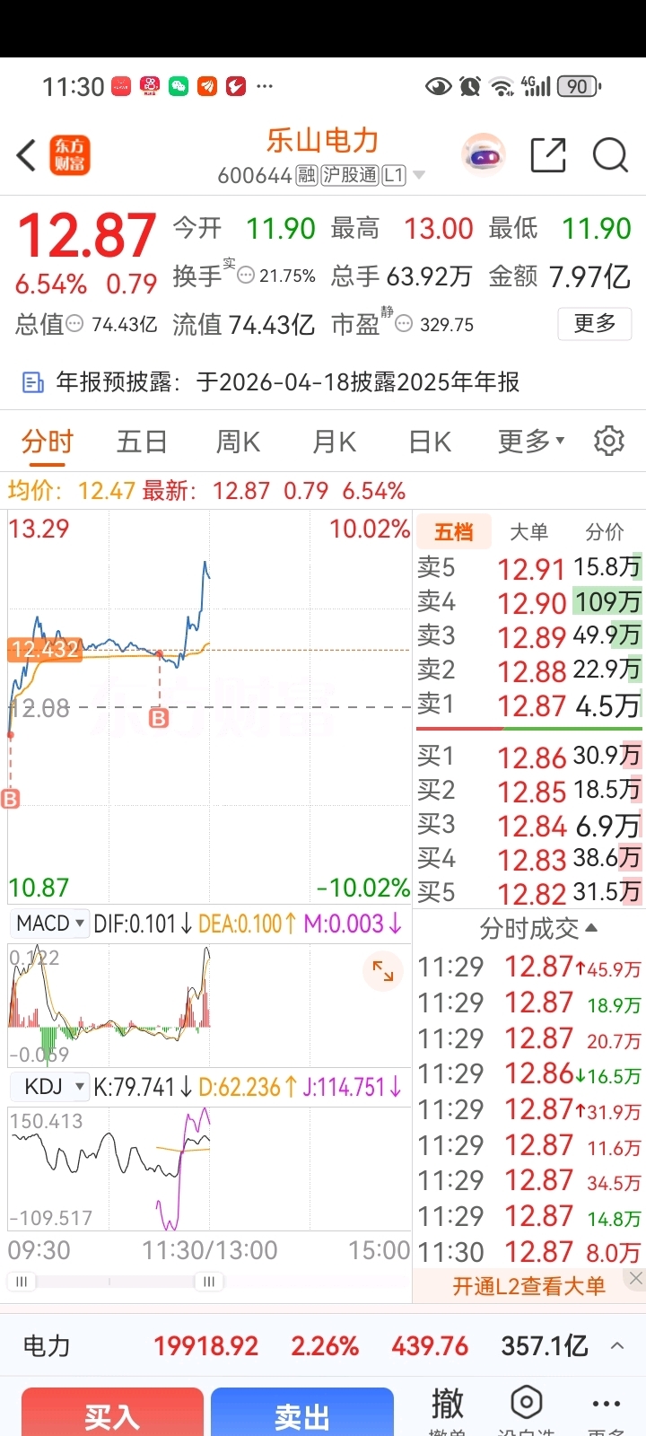 $乐山电力(SH600644)$ 昨天留下一手,成本十七元多,被有些高手羞辱了一翻。今天早盘11.91抄底1000股。盘中发现此票走势非常强势,随后又补仓1000,这不很快就回本了吗?