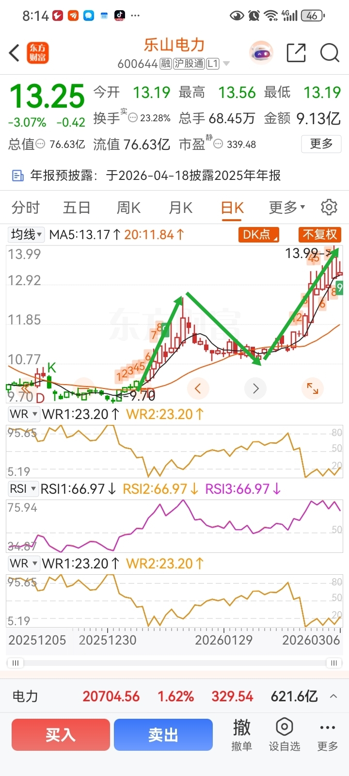 $乐山电力(SH600644)$ 一浪上涨12天,二浪回调,三浪上涨是主升浪,今天三浪第九天。今天是上涨途中歇歇气,也叫回踩五日线。重点是回踩5日线,不叫回调,不叫回调,回调最起码要破5日线,回踩10日,20线甚至60线,大家看看五日线是多少,收在5日线上方。如果真遇到破五日线,就减半仓