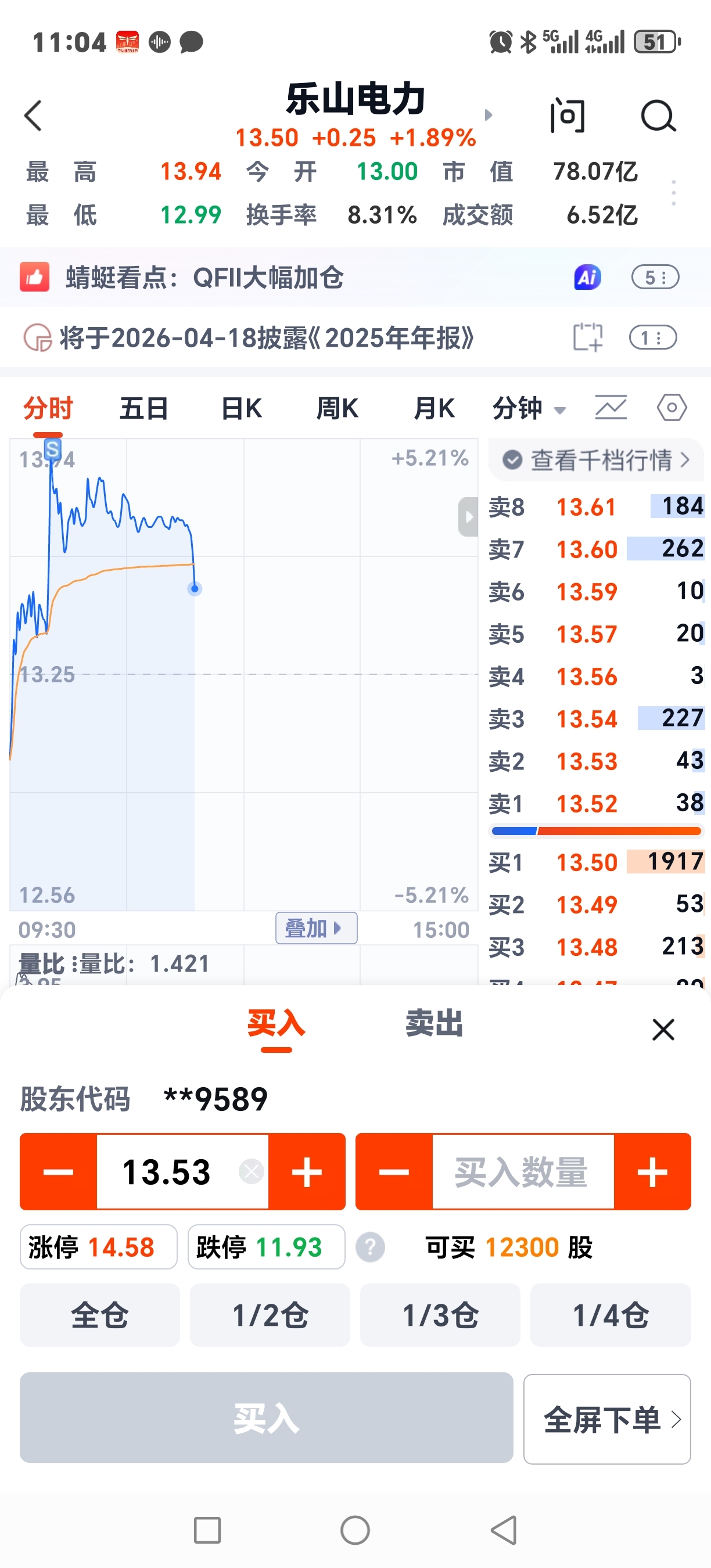 $乐山电力(SH600644)$ 留下的兄弟发财,13.93先走了