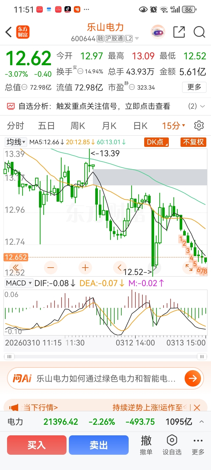 $乐山电力(SH600644)$ 做短线看15分钟。,15分钟上方压力位是13.06。看明天上冲力度如何?如果快速上冲1314的话,说明主力上攻意愿强。大家持股不动为好。