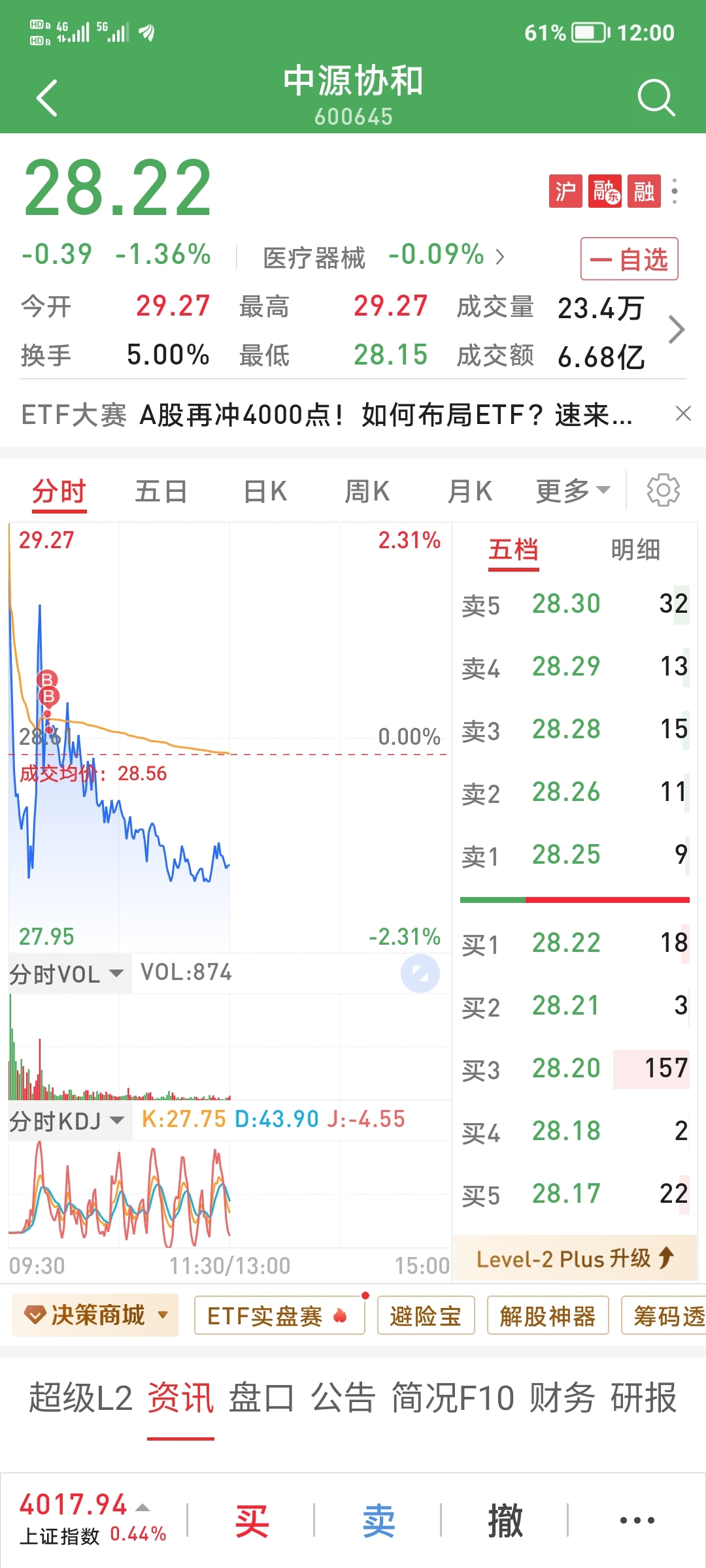 $中源协和(SH600645)$ 现在下午关系不大,承接好的话,明天来一返包的,明天的走势,谁也预测不出来,强的呢,就红盘,不强的就绿牌,就看你拿长线拿短线了,反正我成本价是28.66,好呢,就拿两天啊,不行的就嘎,,但我感觉明天能反包