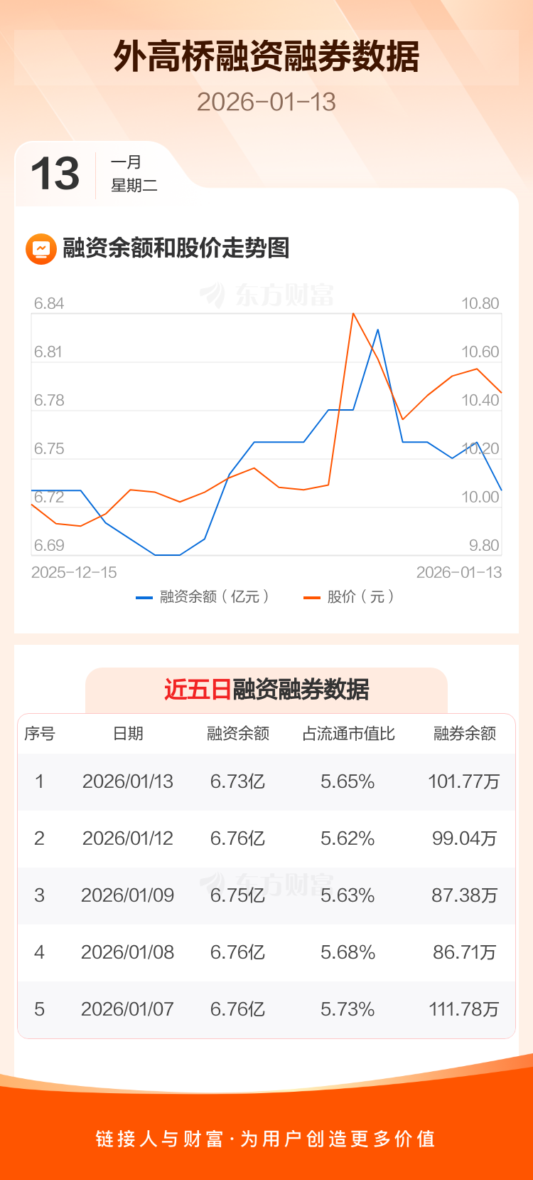 交易所最新数据显示,外高桥于2026年1月13日获融资买入555.18万元,融资偿还845.13万元,当日融资净偿还289.95万元。目前,该股融资余额6.73亿,占流通市值比例为5.65%。
